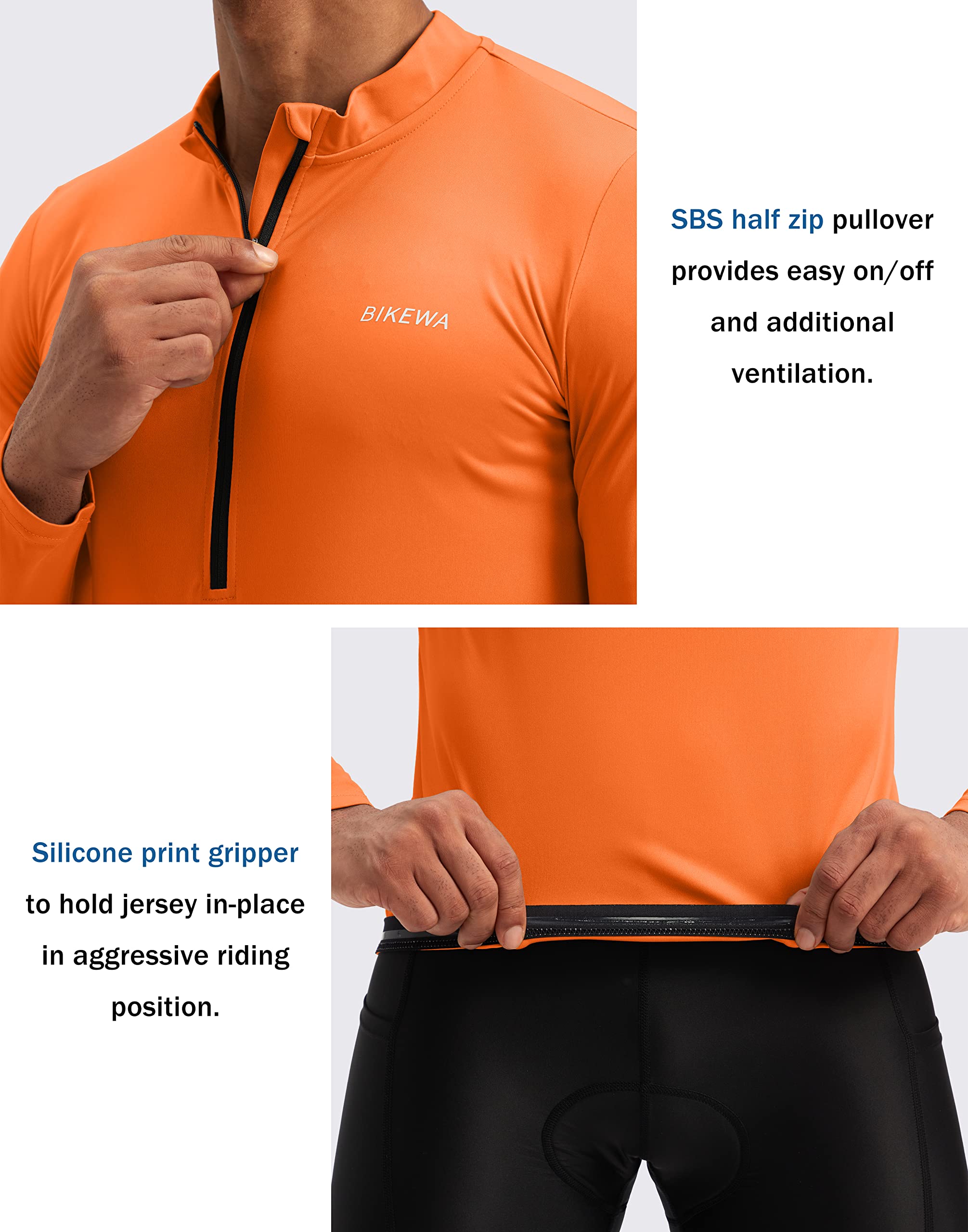 Easy Wear & Silicone Gripper Hems: 11 inch SBS half zip pullover provides easy on / off and additional ventilation, stand collar avoid pucker. Front and rear gripper to hold jersey in-place in aggressive riding position, preventing fluttering in the wind.