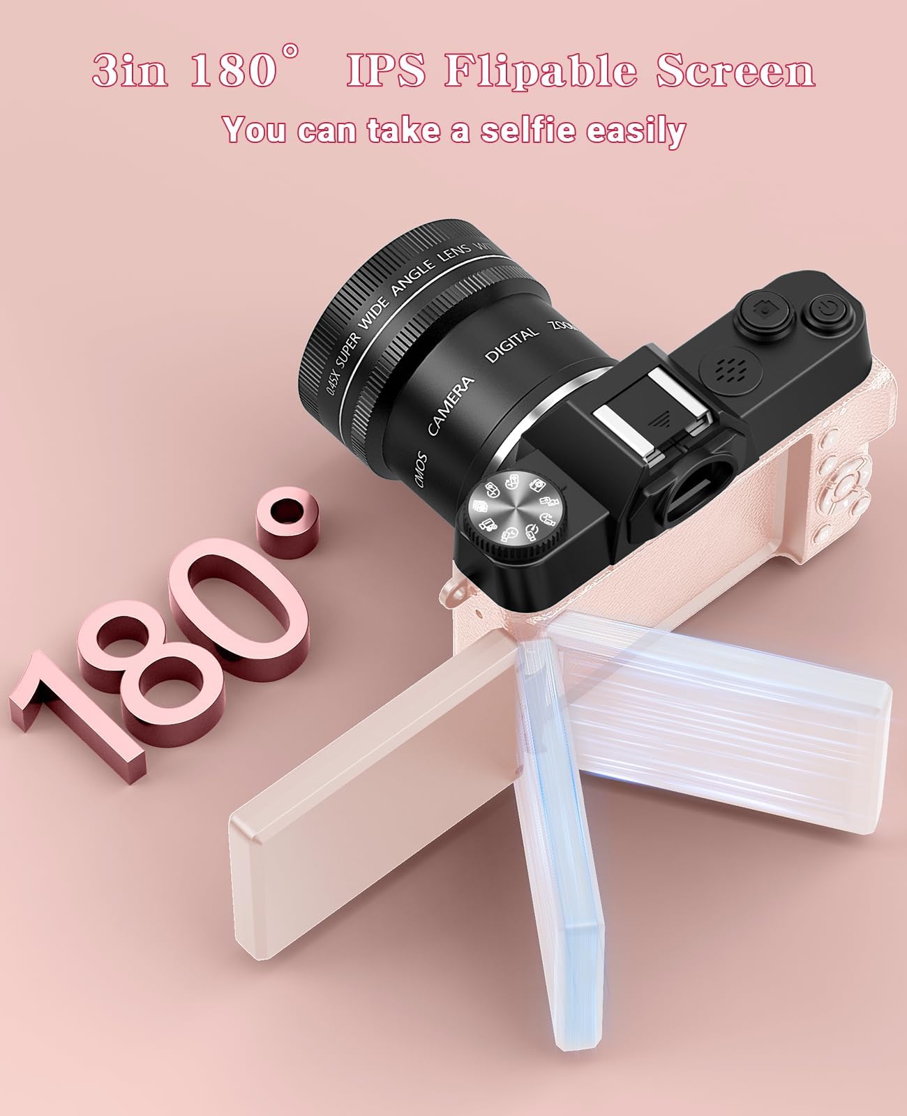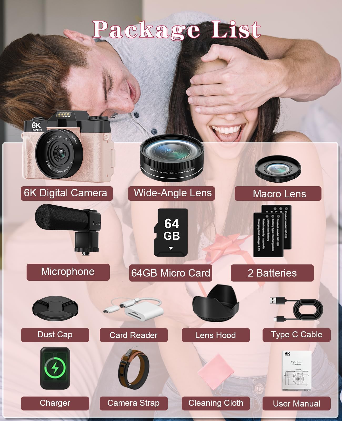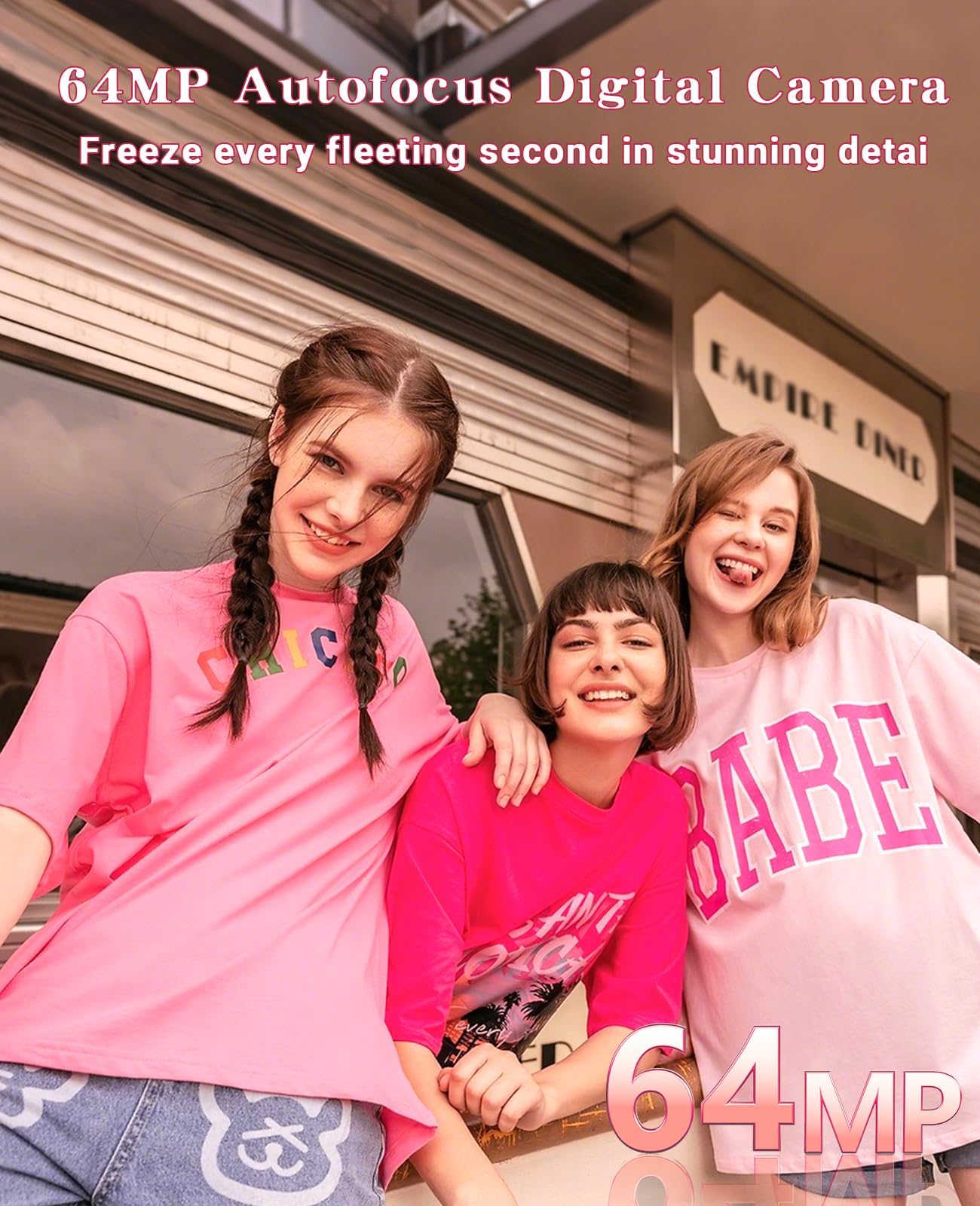 【6K 64MP Digital Cameras】Capture stunning detail with 64MP ultra-clear photos and 6K crisp video vlogging cameras. Perfect for vlogs, travel moments, or creative projects, the autofocus ensures sharp images and smooth tracking.