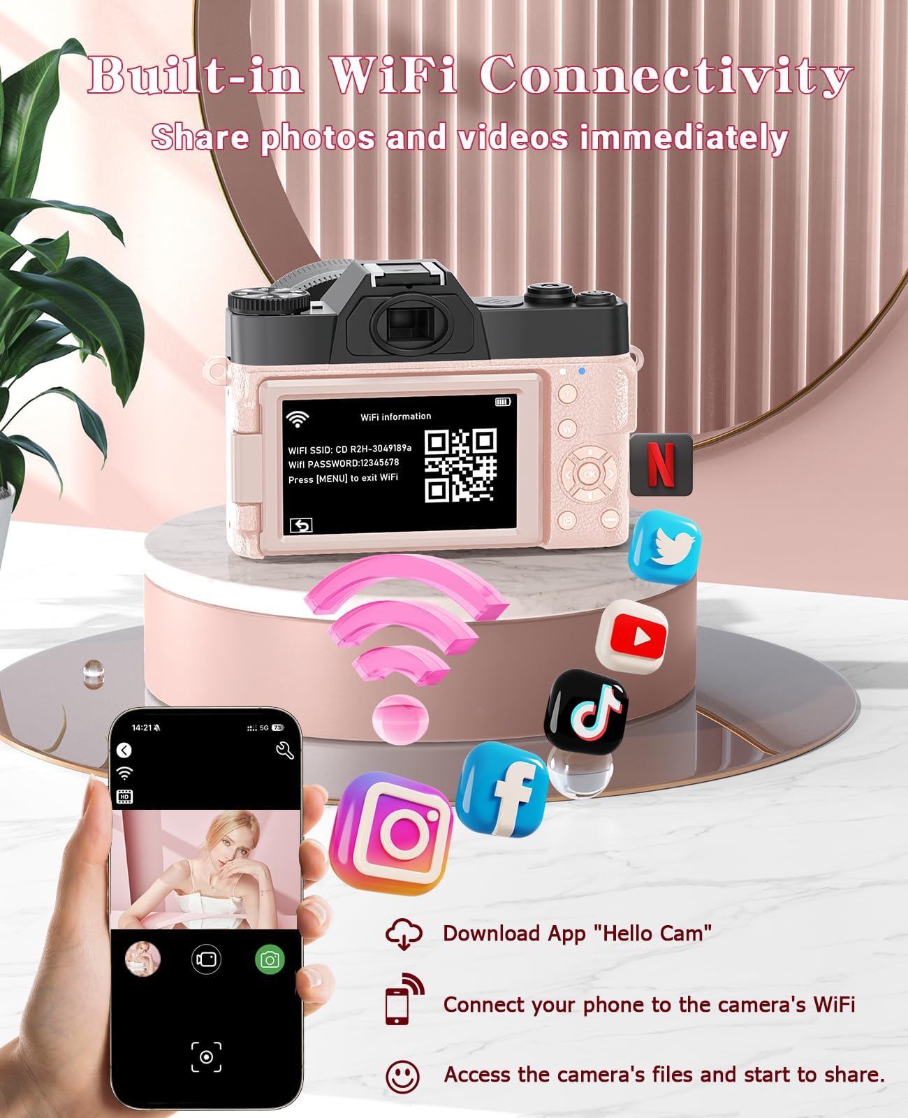 【WiFi Connective】Easily transfer and share photos and videos on social media anytime, anywhere, this digital cameras for photography via WiFi to connect to a smartphone—no cables required.