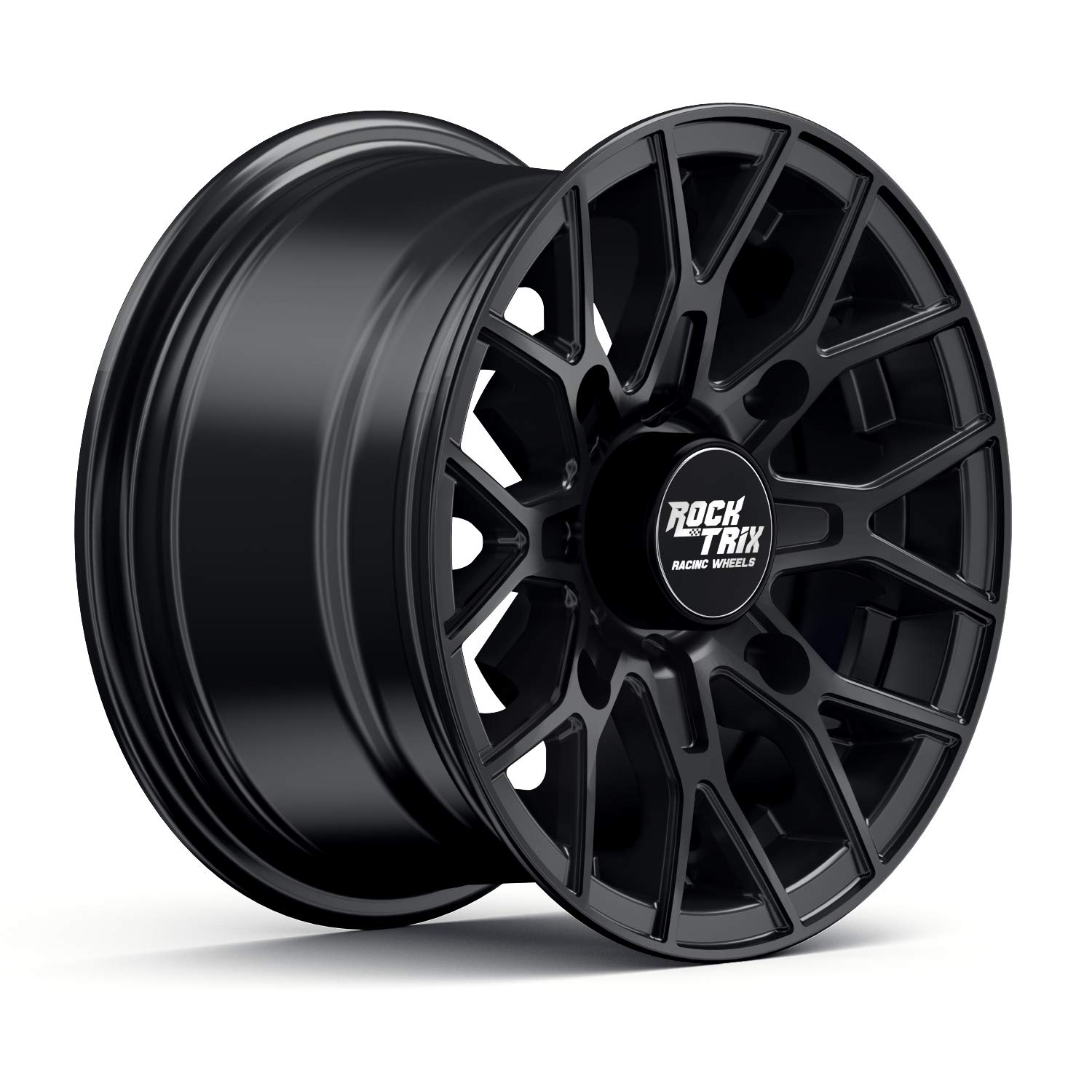 Upgrade to these RockTrix aluminum single piece rims - light years ahead of factory steel rims. Precise, CNC Machined, solid 1-piece cast, lightweight aluminum wheels with a matte black powder finish. Topped with a high quality clear coat that is scratch, rust, and corrosion resistant to ensure your wheels never look cheap. These 14in tire rims are perfect for motorsports, offroad, or daily travel.