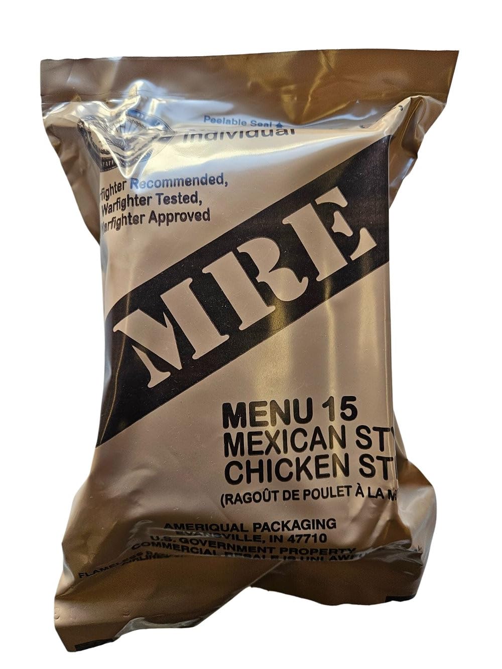USGI MRE [Meal Ready to Eat] - Menus 1-24 [Inspection Date 1/2024 or Newer]. All MREs are brand new and factory sealed. MREs have a shelf life of 5+ years when properly stored in a cool, dry environment. Additional Information: Weight: 1.5lbs; Approximately 1,250 calories [13% protein, 36% fat and 51% carbohydrates] per ration. 24 unique meals as listed below [Please note, Menu contents are subject to substitution, removal and/or change by the manufacturer]: Menu 1 - Chili with Beans Menu 2 - Shredded Beef in BBQ Sauce Menu 3 - Chicken with Egg Noodles and Vegetables: Menu 4 - Spaghetti with Beef and Sauce Menu 5 - Chicken Chunks Menu 6 - Beef Taco Menu 7 - Beef Strips in Sauce Menu 8 - Meatballs in Marinara Sauce Menu 9 - Beef Stew Menu 10 - Chili and Macaroni Meal 11 - Vegetable Crumbles with Pasta in Taco Sauce Menu 12 - Elbow Macaroni Meal 13 - Cheese Tortellini and Tomato Sauce Meal 14 - Creamy Fettuccine Meal 15 - Mexican Style Chicken Stew Meal 16 - Chicken Burrito Bowl Meal 17 - Pork Sausage Patty, Maple Flavor Meal 18 - Beef Ravioli in Meat Sauce Meal 19 - Jalapeno Pepper Jack Beef Patty Meal 20 - Italian Sausage with Peppers & Onions Meal 21 - Lemon Pepper Tuna Meal 22 - Beef Goulash Meal 23 - Pepperoni Pizza Slice Meal 24 - Southwest Style Beef and Black Beans Please Note: Menu contents are subject to substitution, removal and/or change by the manufacturer.