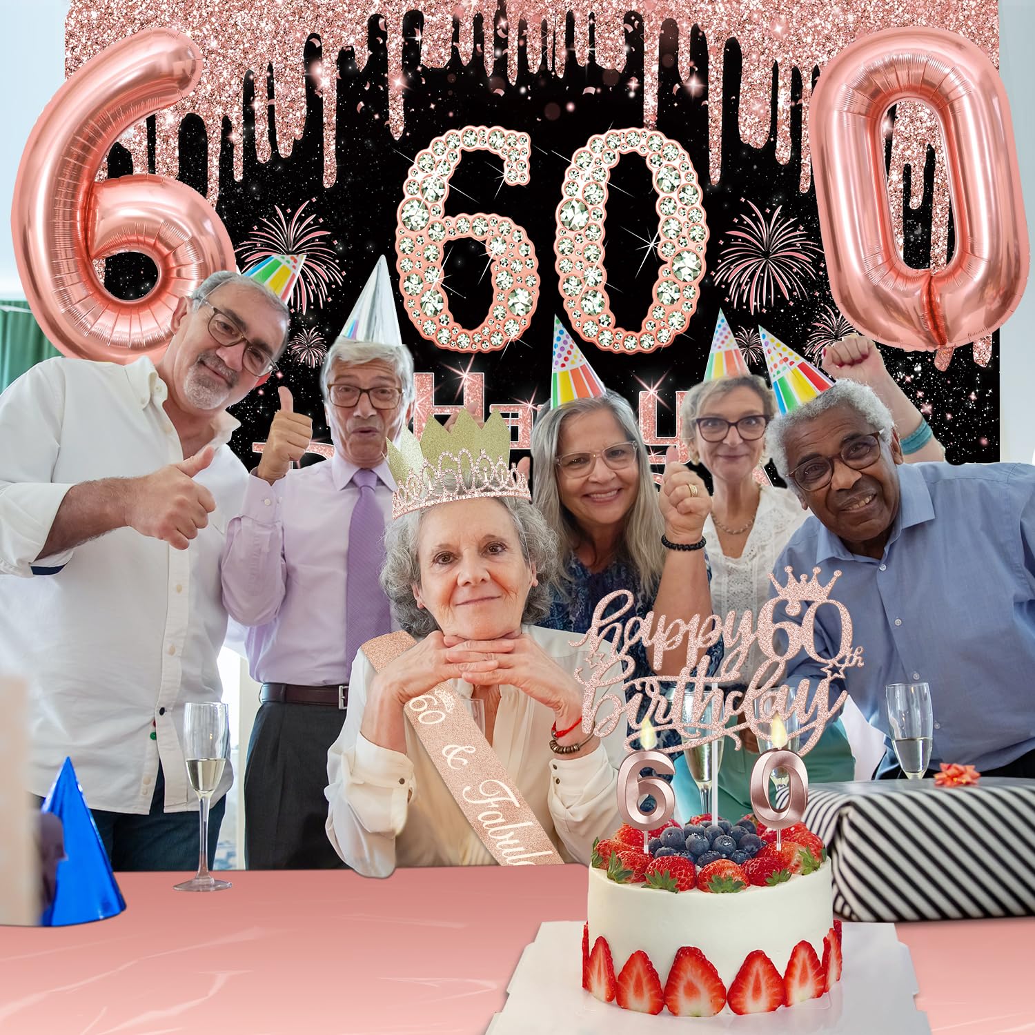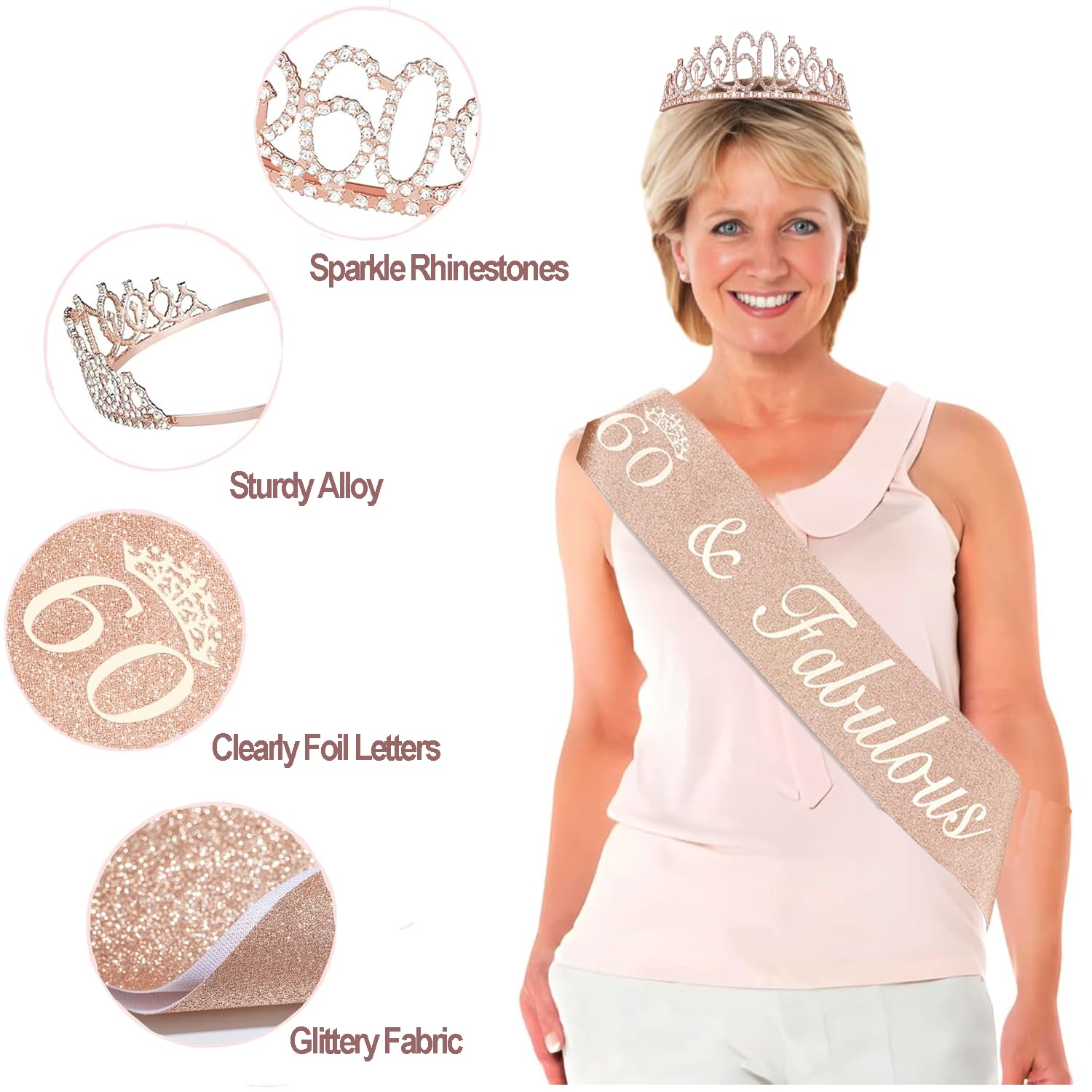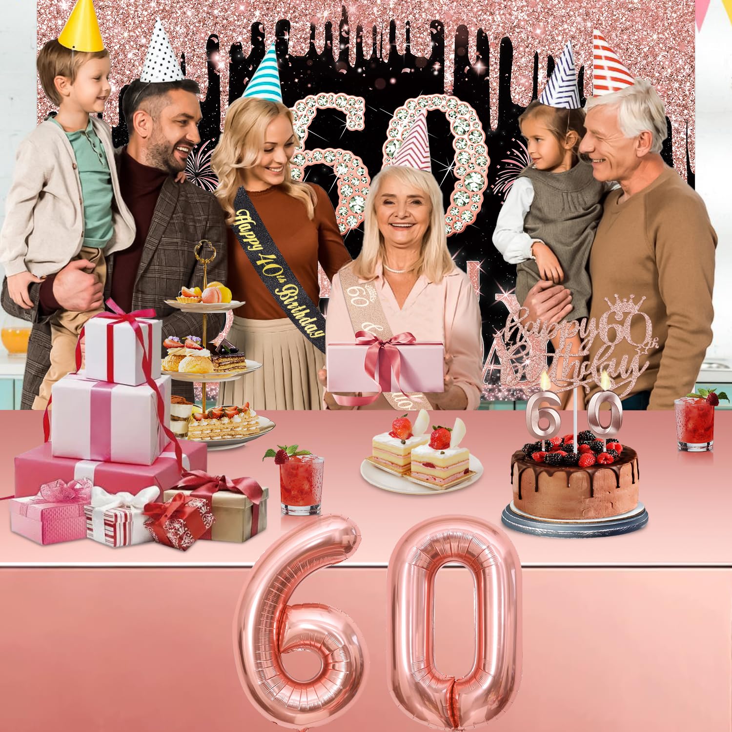 60th Birthday Decorations: Package coming with 60th Birthday Banner *1pc, 60th Birthday Tiara *1pc, 60th Birthday Sash *1pc, Happy 60th Birthday Cake Topper *1pc, 60th Birthday Candles *1set, 60th Birthday Balloons *1set, Rose Gold Tablecloth *1pc. The rose gold 60th birthday party decoration pack is the best way to meet different decorating needs; the all-in-one kit is perfect for creating an elegant and dreamy 60th birthday