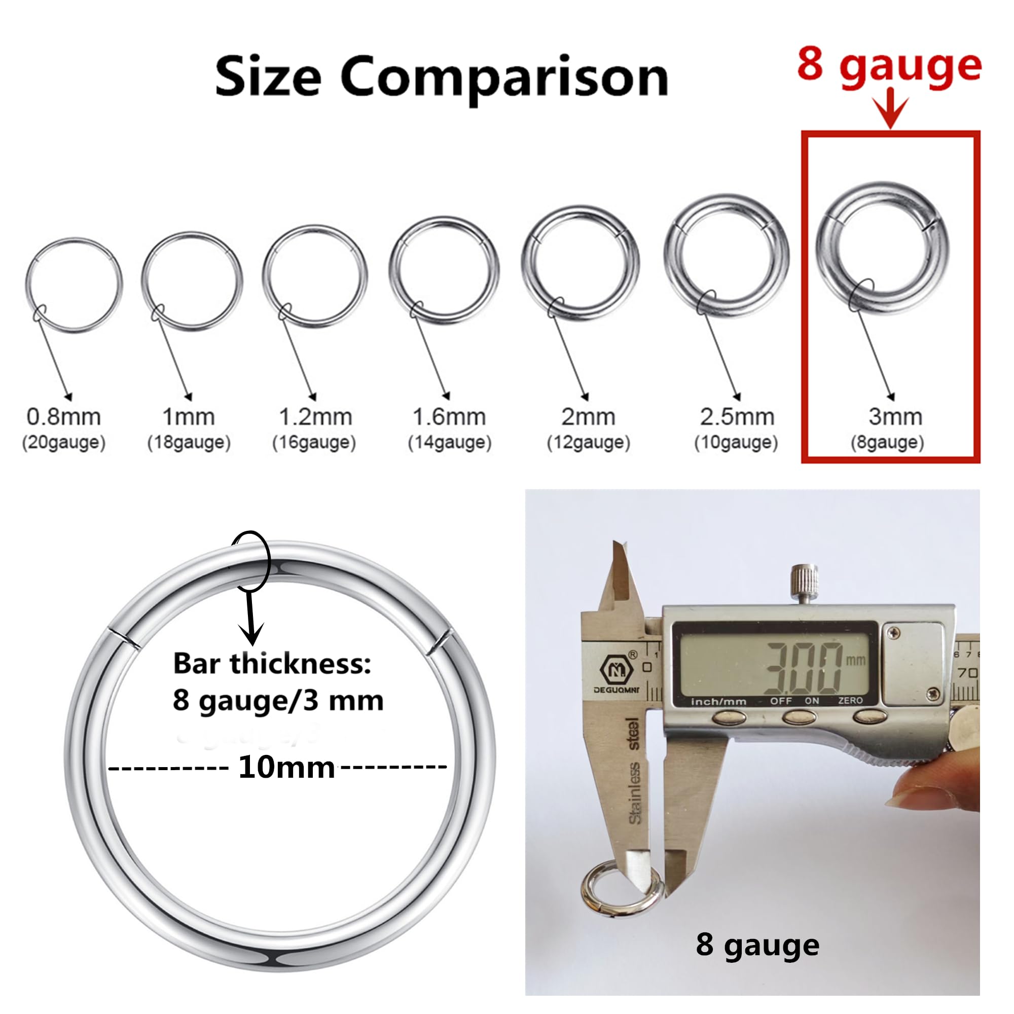 Sold individually Nose Hoop Ring/Earring Hoop Size: 8 gauge (thickness: 3.0mm), inner diameter 25/64 inches(10mm ),8 gauge is VERY THICK, 8 gauge is quite thick. so please pay attention to its thickness. Please check the size carefully. 8 gauge thickness is 3.0mm.