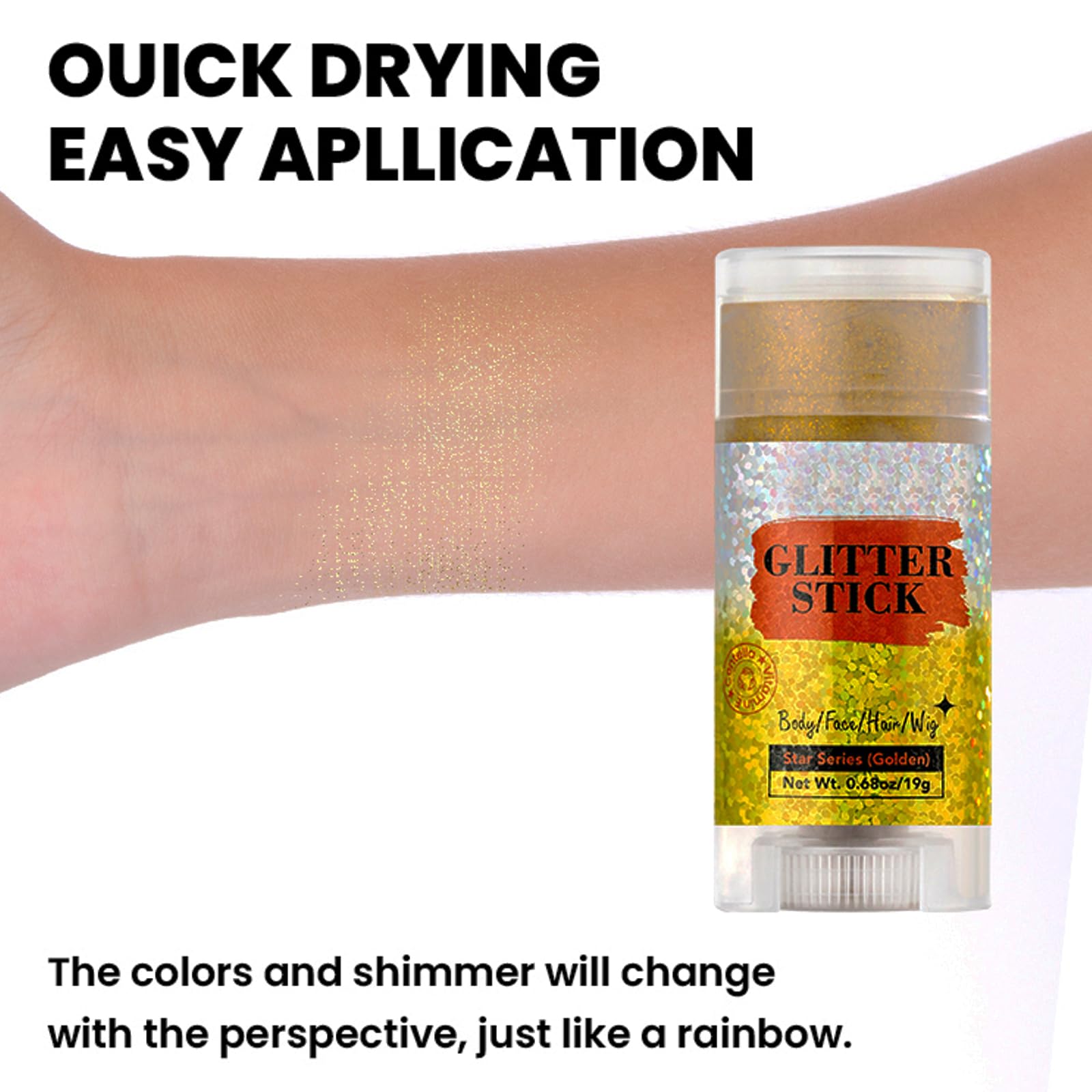 Easy To Apply And Remove:Achieve a sparkle glitter makeup with ease using this gold body glitter stick!The convenient stick format makes application super simple—just swipe it on your skin or hair,and you're instantly glowing.Perfect for adding sparkle to your look in seconds.Plus,it's easy to remove at the end of the day without any hassle. Whether you're prepping for a night out,a special event,or just want to add some shimmer to your skin,this glitter stick is the perfect way to shine.