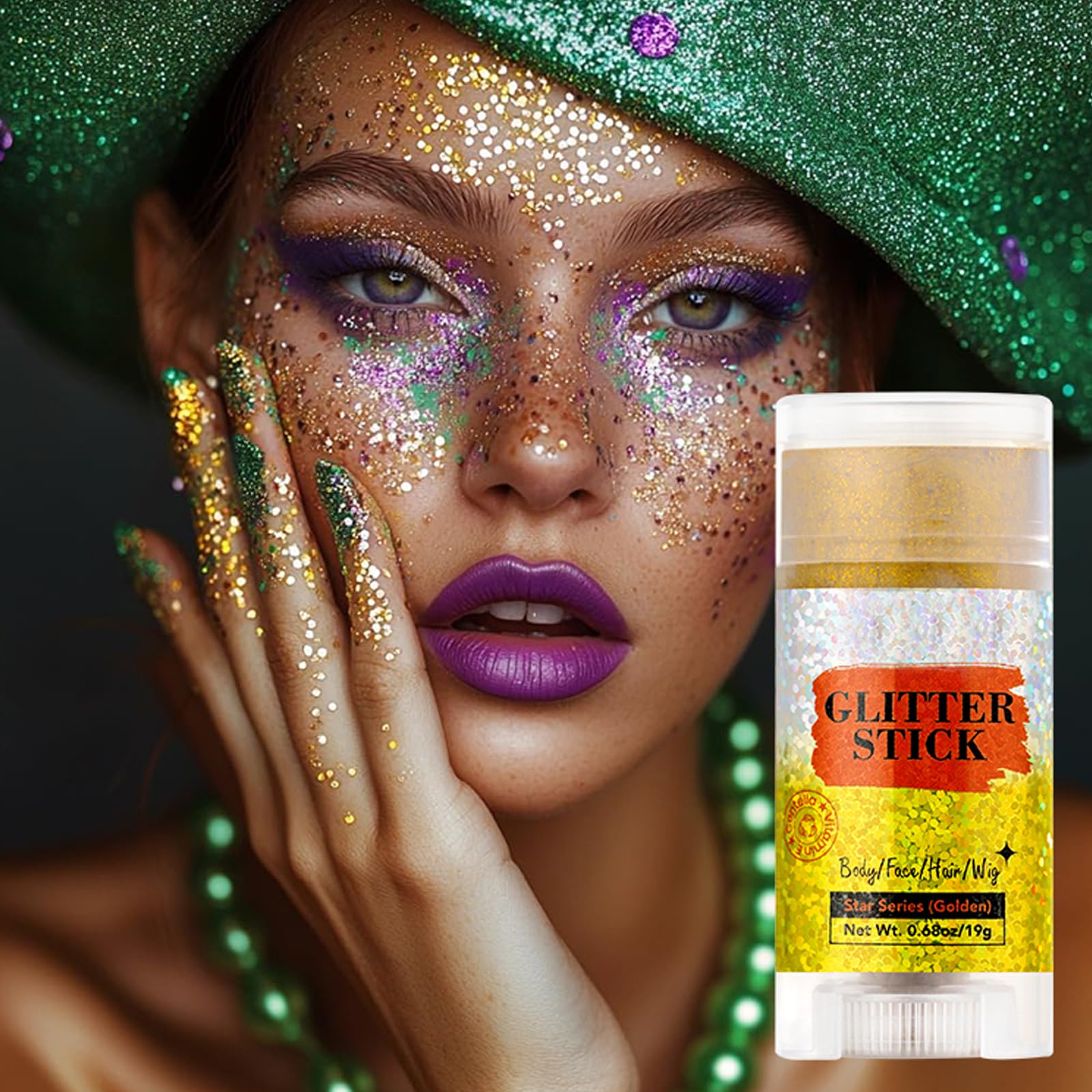 Multiple Uses:The gold face body glitter is your all-in-one beauty essential for multiple uses!Apply it to your face,body,hair,cheekbones,collarbones,and arms for a stunning, shimmering effect.Whether you're adding a touch of glamour to your hair,or glowing all over,this glitter stick is perfect for any occasion,like mardi gras,music festival,party.Elevate your shine with a product that delivers dazzling results wherever you choose to apply it.