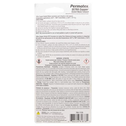 Permatex Ultra Copper Maximum Temperature RTV Silicone Gasket Maker is the most advanced, high temp RTV silicone gasket available. Three times more oil resistant than conventional silicones and eight times more flexible than cut gaskets, it is sensor-safe, low odor, and non-corrosive with superior adhesion. Highest operating temperatures for 4-cylinder, turbocharged or high-performance engines and OEM specified, with a temperature range of -75 degrees fahrenheit to 700 degrees fahrenheit intermittent. Also resists auto and shop fluids and vibration. These gasket makers offer significant performance advantages, excellent torque retention and hi-temp, sensor-safe properties. Extended warranties, engine sensors and new component materials such as aluminum, bi-metal alloys and high-tech plastics, have created the need for superior RTV silicone gasket makers in both OEM production and service applications. Permatex always has the right gasket maker for your application.