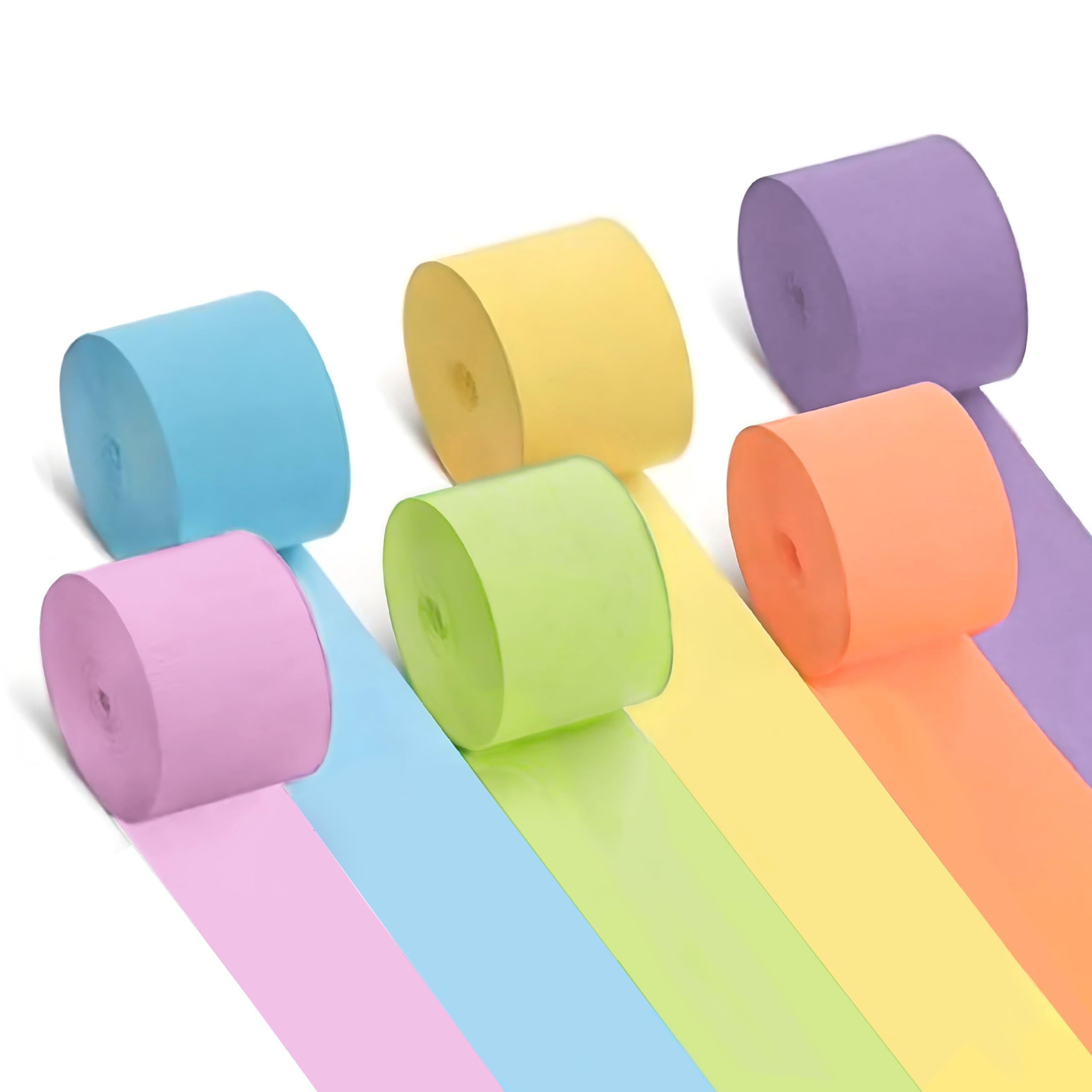 Vibrant Streamers multipack of 6 crepe paper streamers, perfect for pastel party decorations. Includes Baby Blue, Sunny Yellow, Lime Green, Soft Pink, Lavender, Pastel Orange good for pastel rainbow decor. Each roll 82 ft long and 1.8" wide.
