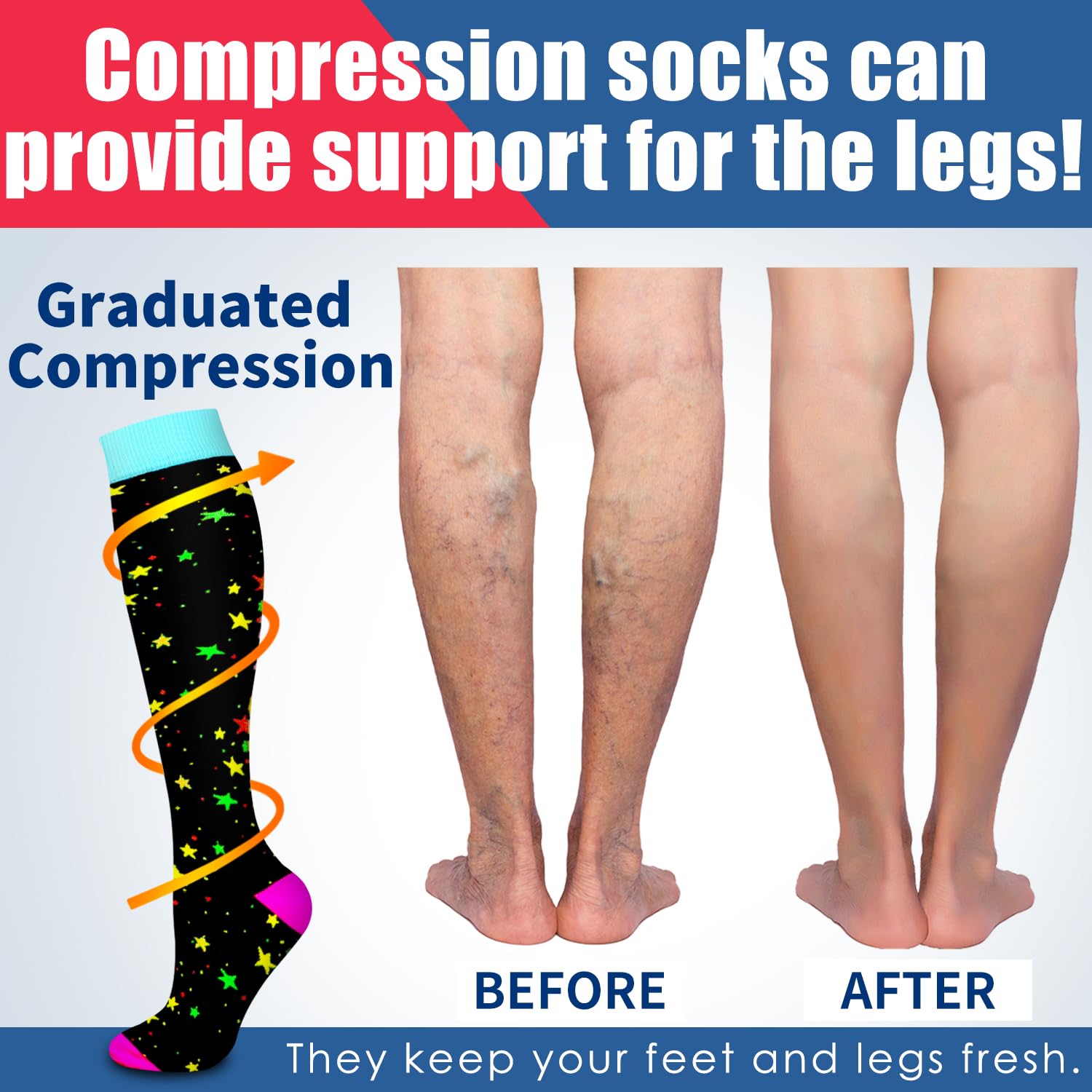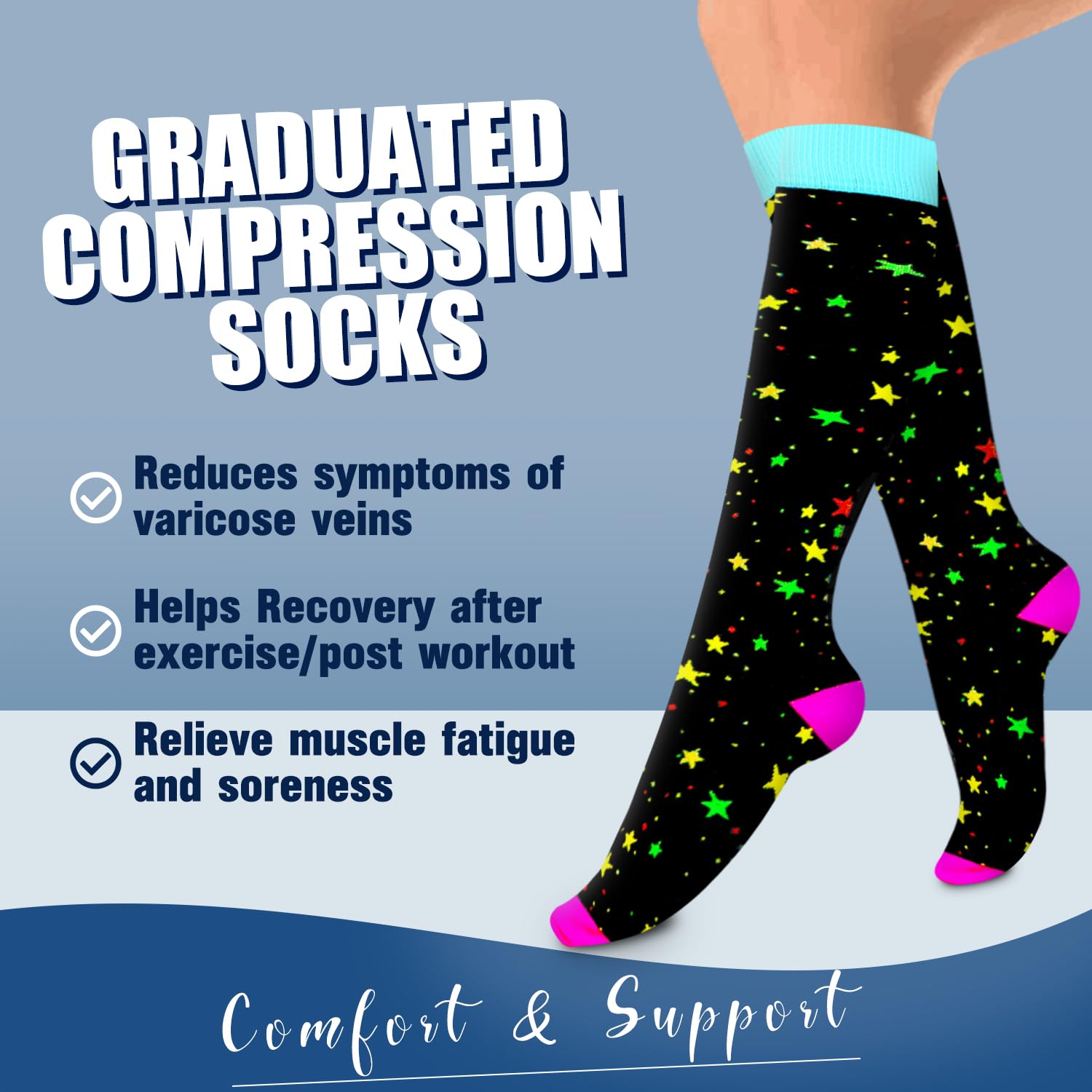 REVIVES&ENERGIZES-Our compression socks help relieve pain,improve circulation,boost leg stamina,support veins,reduce foot and leg soreness.Our compression socks are a lifesaver for those who don’t need a high level of compression but are still looking for a pair that would help maintain healthy legs.Sit + Stand + Travel + Recover,Slip on a pair of our socks,Increase Energy,Prevent Swelling,All Day Comfort.We aim to comfort every tired leg regardless of its age,gender,hobby,profession.