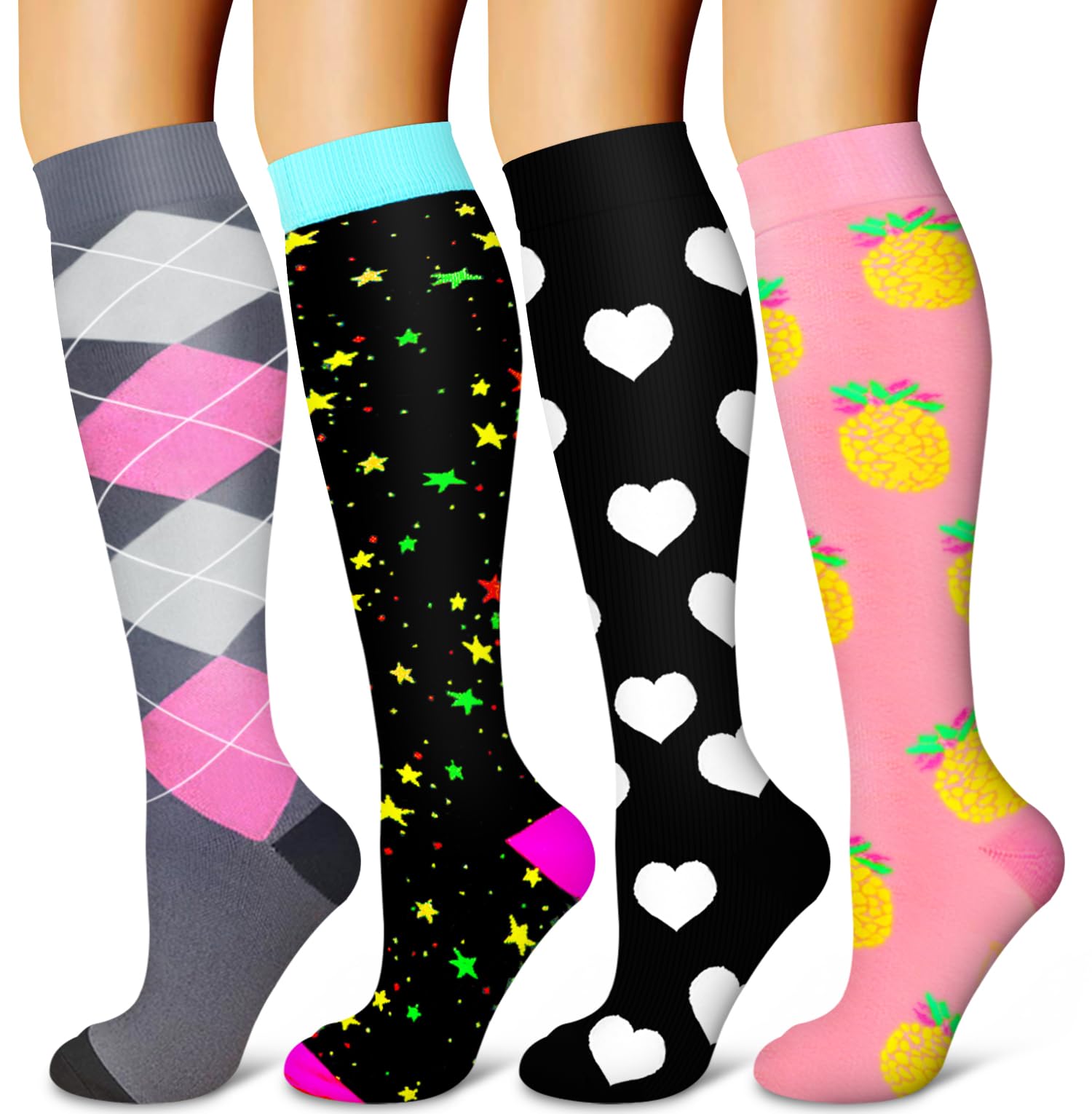4 PAIRS OF UNISEX -Our compression socks are made up of high-quality Lycra fiber.The design is ergonomic to give ultimate comfort.You can best describe them in two words:flexible and durable. Affordable prices without sacrificing comfort, quality, and fashion.High performance material and temperature control,keeping your muscles cool during workouts and warm during rest.You can expect them to alleviate any mild leg pain and swelling that hinders a productive -free day.