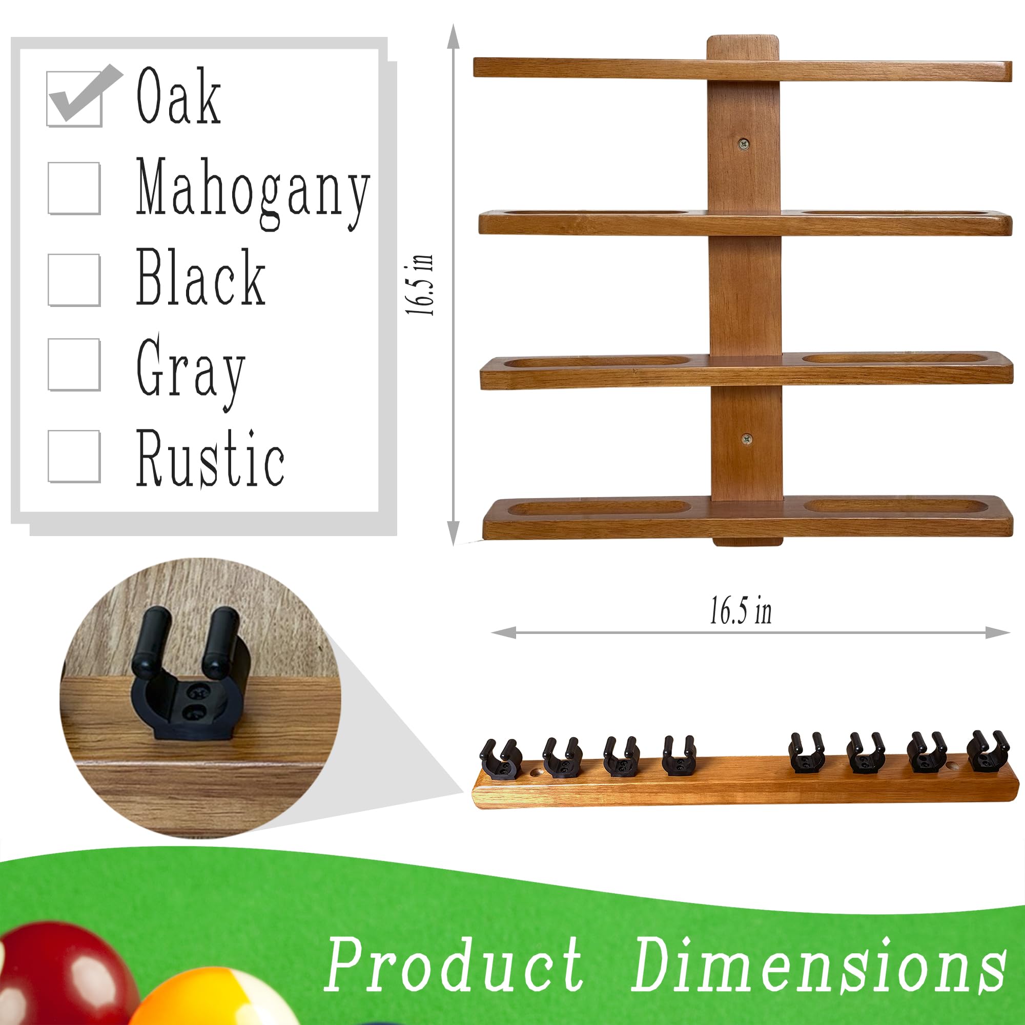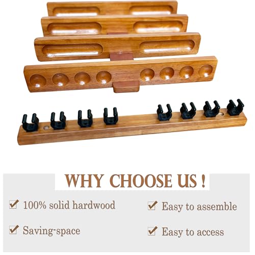 CRAFTMANSHIP: This billiard cue rack made of 100% solid hardwood which is environmentally friendly, and elegant through high-quality workmanship. Each face, edge and corner of the pool rack has been fully polished to make it smooth and free of burrs.