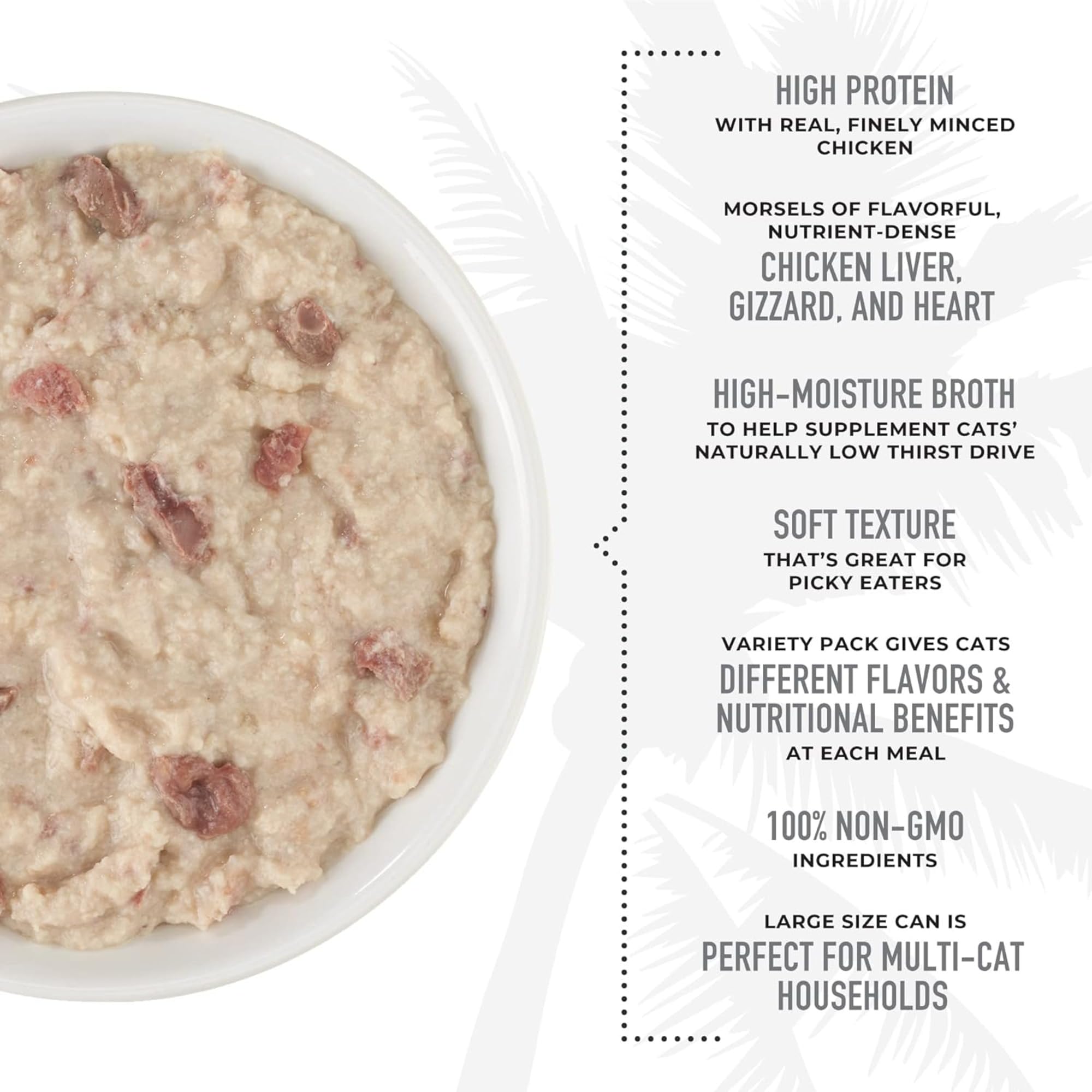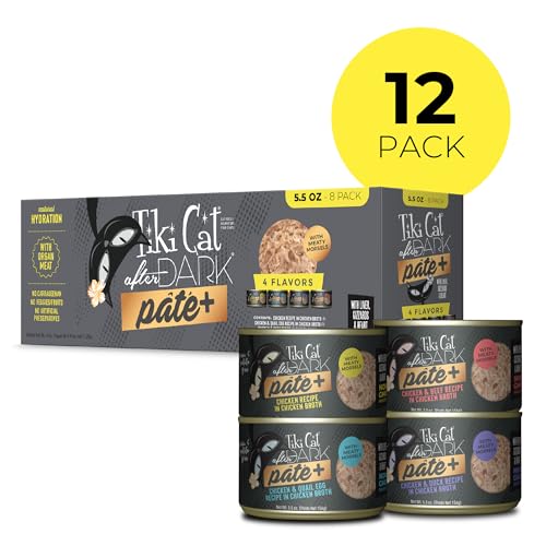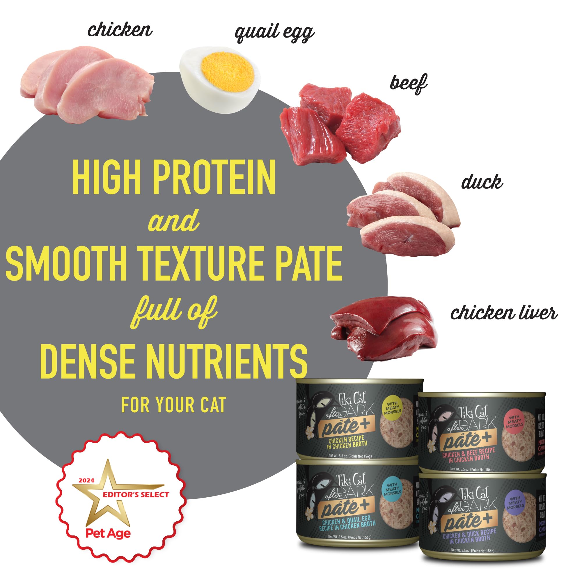 As obligate carnivores, cats have a natural instinct to hunt after dark and a nutritional need to eat meat. Tiki Cat After Dark Pâté+ is a meat-lover’s dream, closely mimicking cats’ natural prey diets. Real, finely minced chicken is combined with duck, beef, or quail egg - plus meaty morsels of organ meat - in savory broth for a soft, meaty meal cats love. Treat your carnivore cat to four favorite After Dark Pâté+ recipes in this exciting Variety Pack!