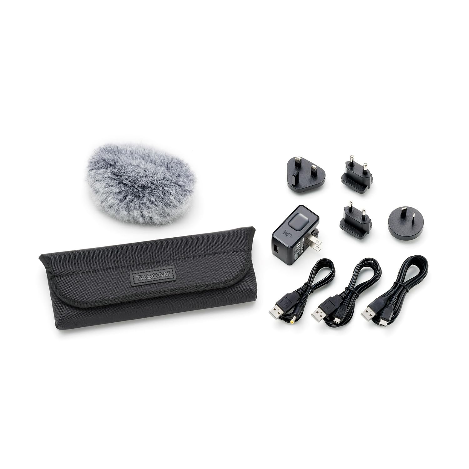 The TASCAM AK-DR11GMKIII Audio-For-Video Recording Kit includes microphone windscreen, power supply, multi-cables, and soft bag