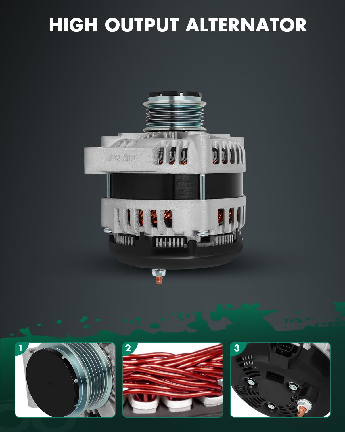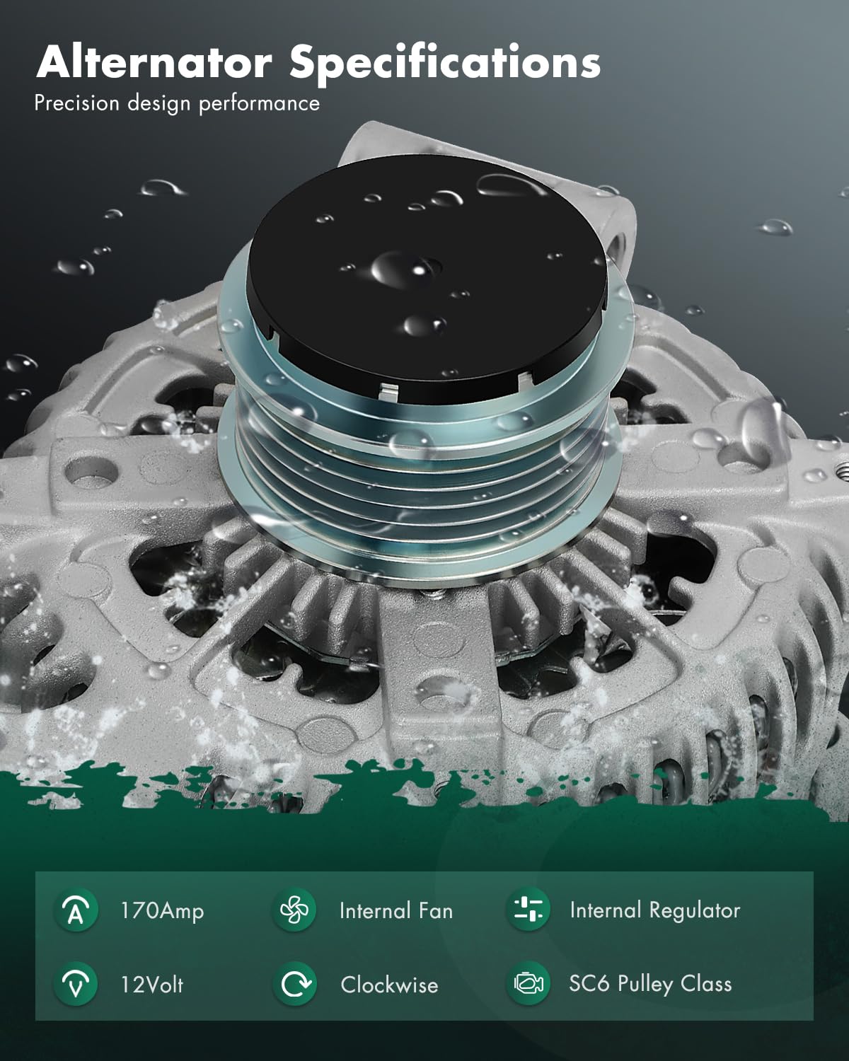 【High-Performance Specifications】 – Engineered with Voltage: 12V; Amperage: 170Amp; Rotation: CW (Clockwise); Regulator: IR (Internal Regulator) ; Fan: IF (Internal Fan); Grooves: SC6 Pulley Class; Condition: New, high output alternator is compact and lightweight, fully compatible with the electronic system of your vehicle, this automotive replacement alternator delivers reliable power for your car, it’s built to meet the demands of modern vehicles