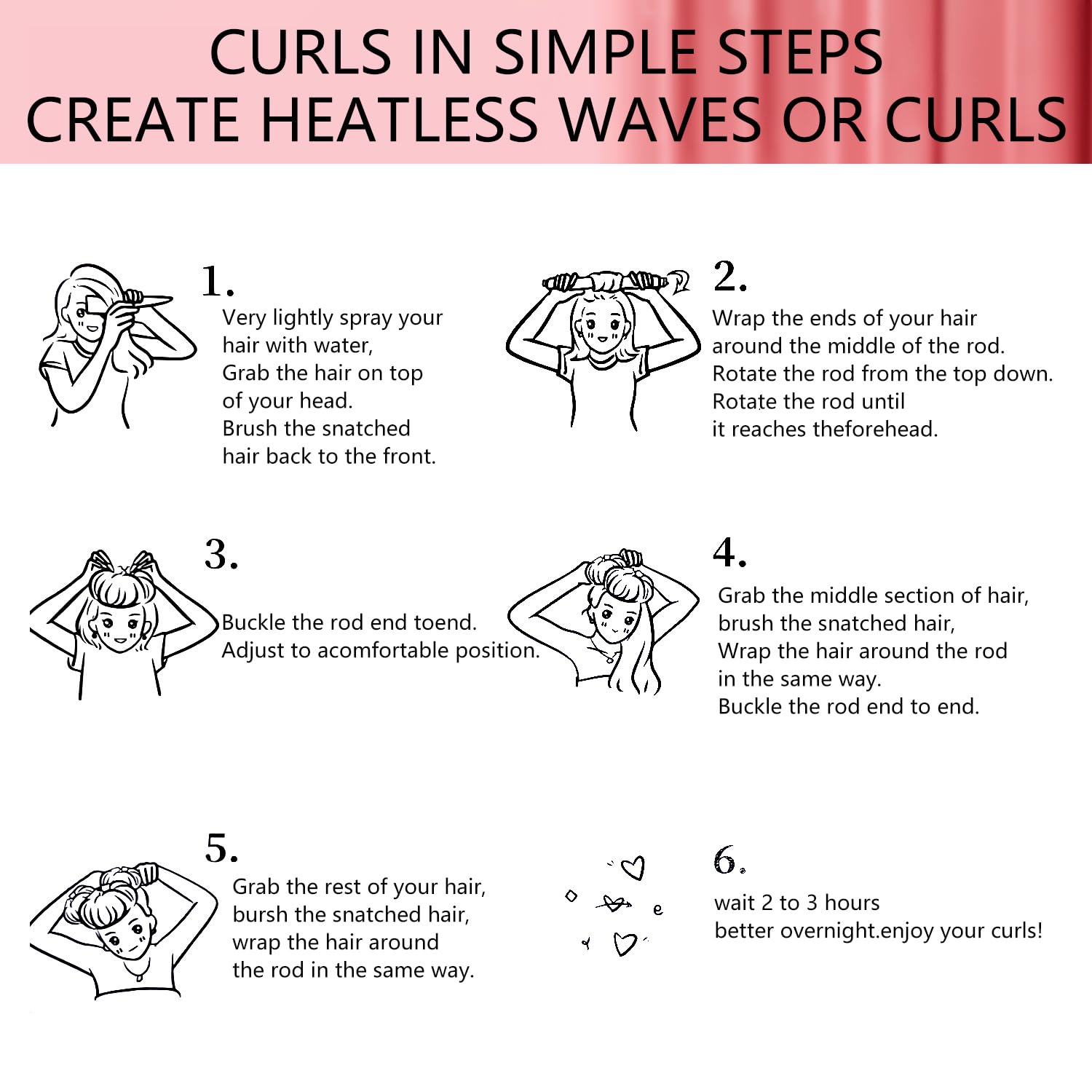 【Easy To Use】1:Place the curling rod on your head and wrap your hair around it. Lock the hook on ends of the curling rod and secured with clips. 2:Tie the headscarf. 3:Go to sleep and wake up with a perfect hair