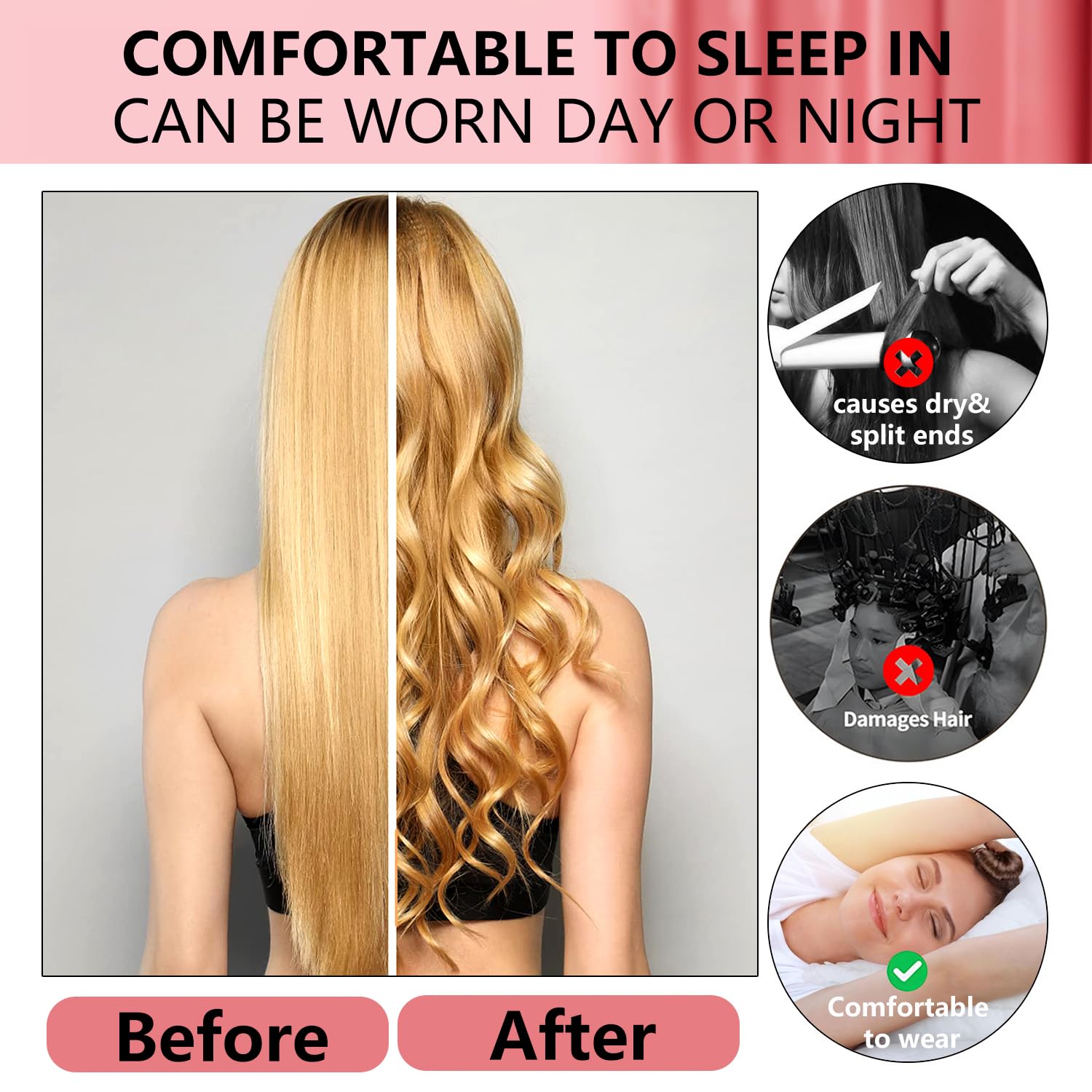 【Wear Them Day And Night】Hair curlers to sleep in.Fall asleep comfortably and wake up looking beautiful.The soft satin material is gentle on your hair and scalp, allowing you to sleep in total comfort and wake up to perfect curls or waves.Heatless curls overnight