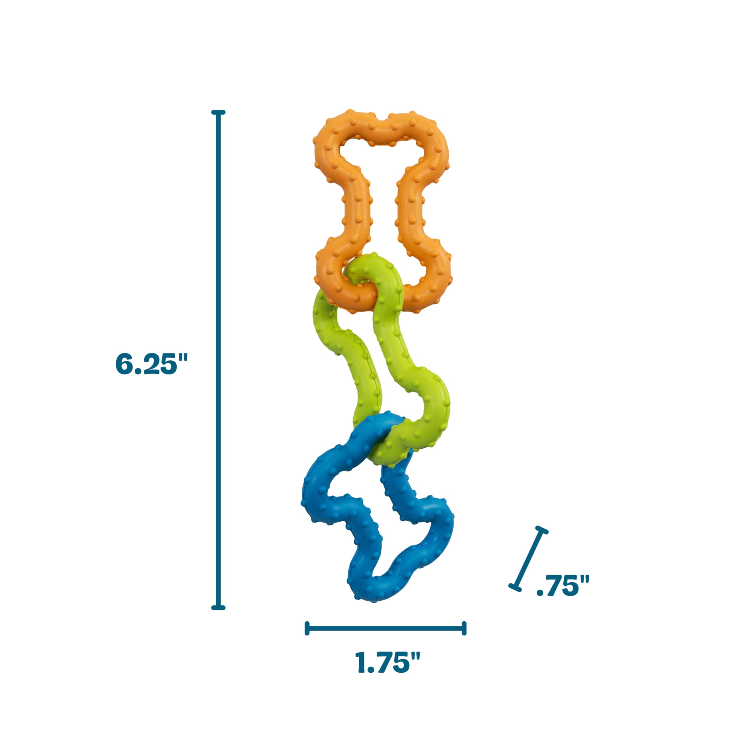 Product Description Amp up playtime with the Pupstages Bone Tugz Tug and Chew Dog Toy, designed for teething pups and small dogs who love action. Made with interlocking rubber bones, this bendy, durable toy is built for tugging, shaking, and chewing. The nubby texture gently massages gums to help soothe teething mouths, while the perfectly sized design makes it great for fetch, solo play, or tug-of-war fun. From bonding moments to energetic play, Bone Tugz delivers engaging enrichment that helps keep pups happy and active. SAFETY & CARE: This is a non-edible play toy. When choosing a toy, make sure to choose an appropriate size toy for your dog. As with any chew toy, we recommend monitoring your dog's use and replacing after reasonable wear, no toy is indestructible. ALWAYS supervise your dog when using a toy of any kind. Remove if excessive chewing occurs or if pieces larger than a piece of rice are chewed off. Know your dog’s chewing habits, your pet’s safety is your responsibility. For dogs only. Keep out of reach of children. Ultimately, your pet's safety is your responsibility. Set Contains: 1 x Petstages Bone Tugz Puppy & Small Dog Toy