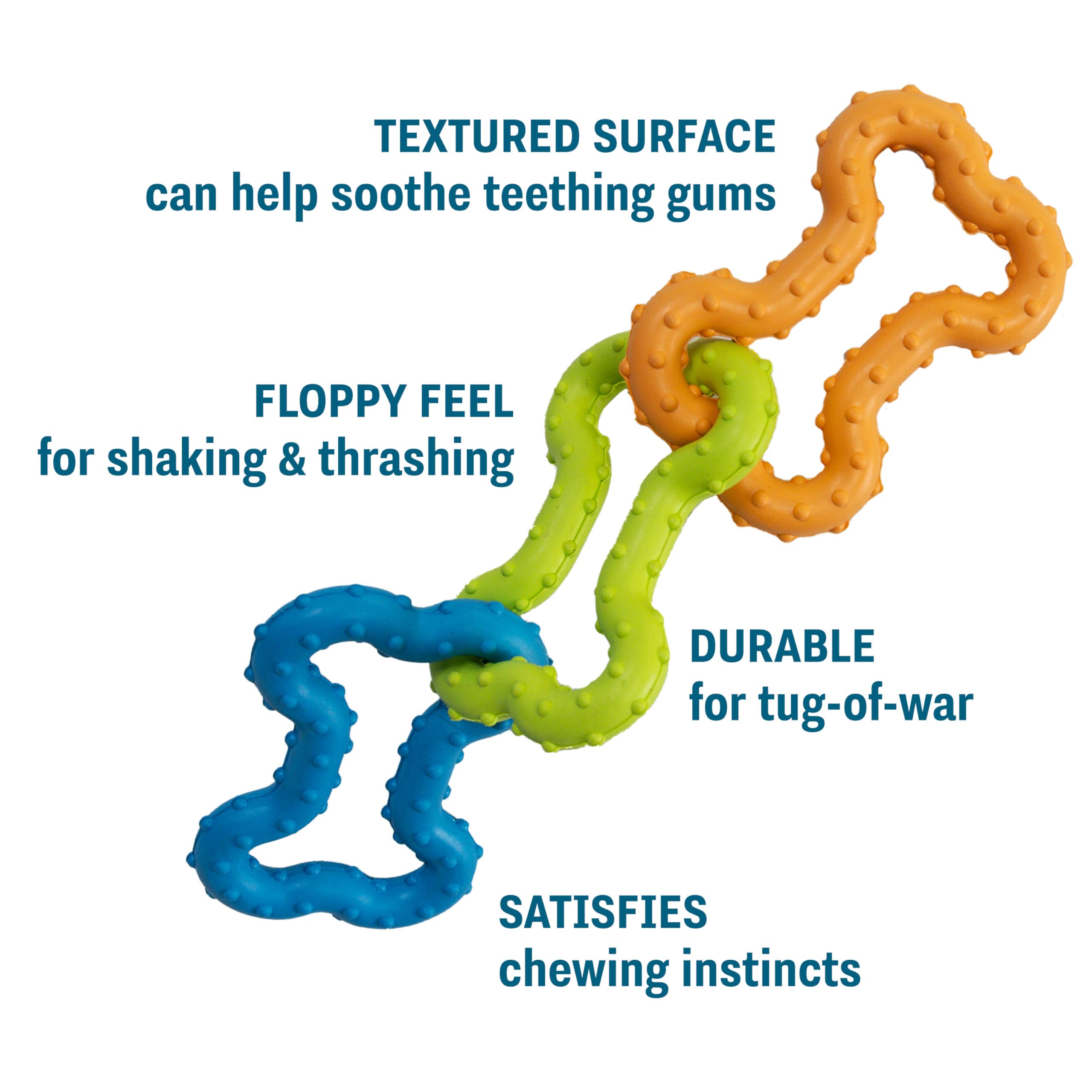 Tough But Gentle on Teeth: Interlocking rubber bones create a floppy feel dogs love to shake, thrash, and tug; suitable for light-moderate chewers