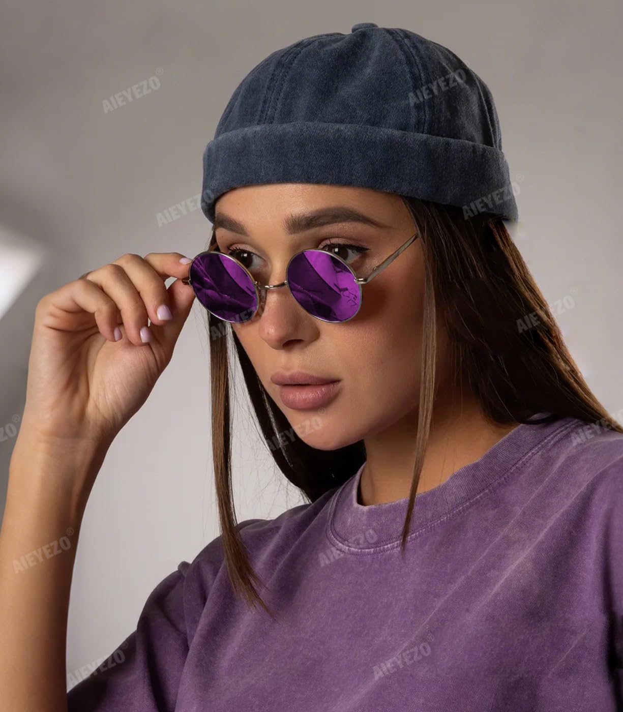 SMALL ROUND POLARIZED LENSES ►The world seen through blue mirror lenses, Mirror lenses act like a one-way mirror. They are made of a lens covered by mirror coating of a given color. The mirror coating decreases the amount of light passing through these lenses making them ideal for sunny days.