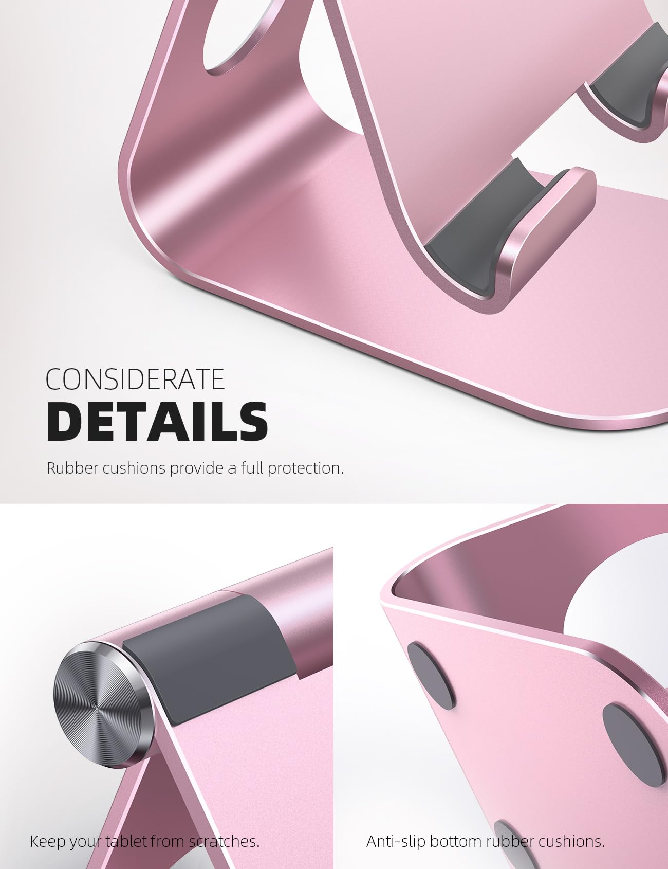 【STURDY CONSTRUCTION& RUBBER PADS】 Rubber pads and feet of tablet stand can protect your device from daily scratches and sliding