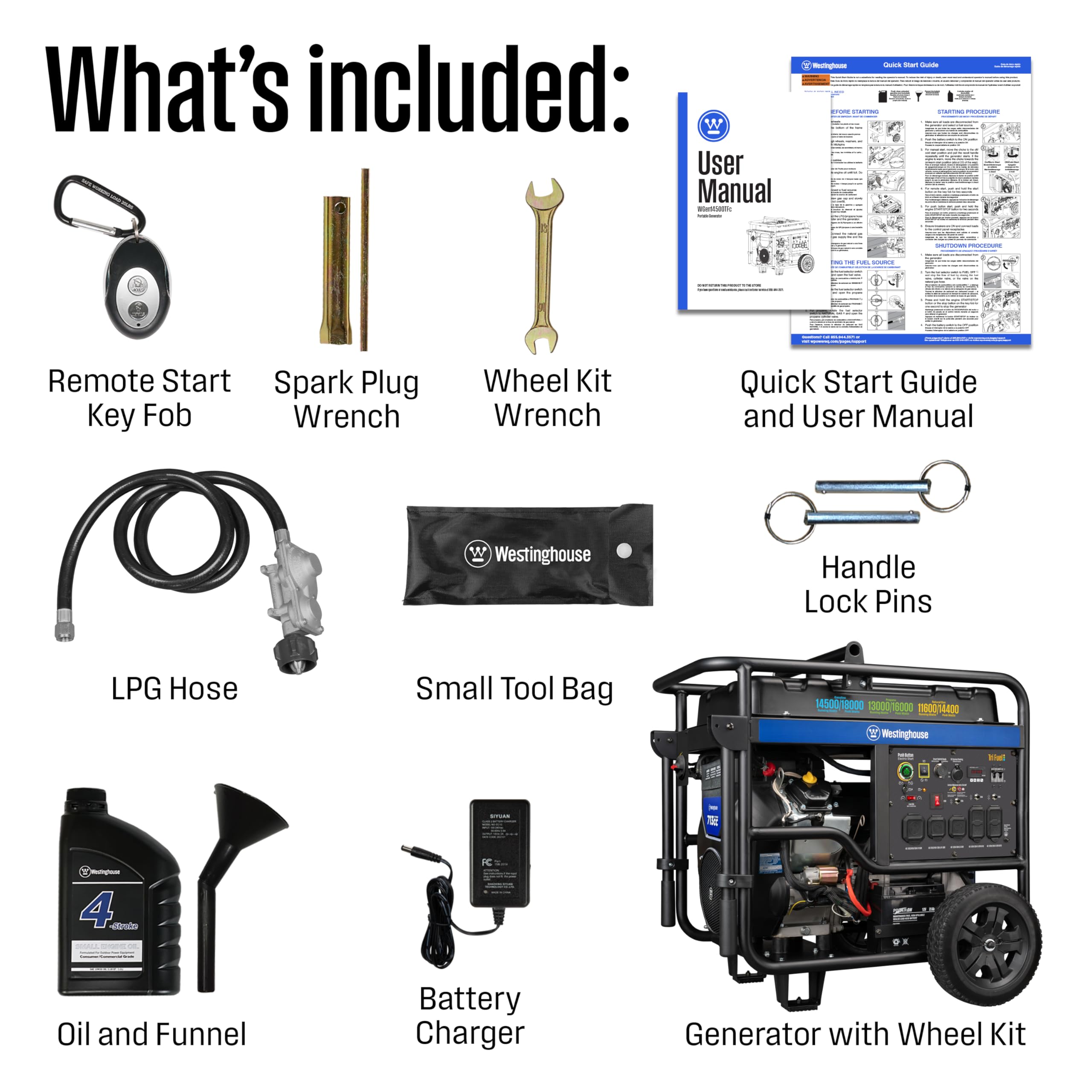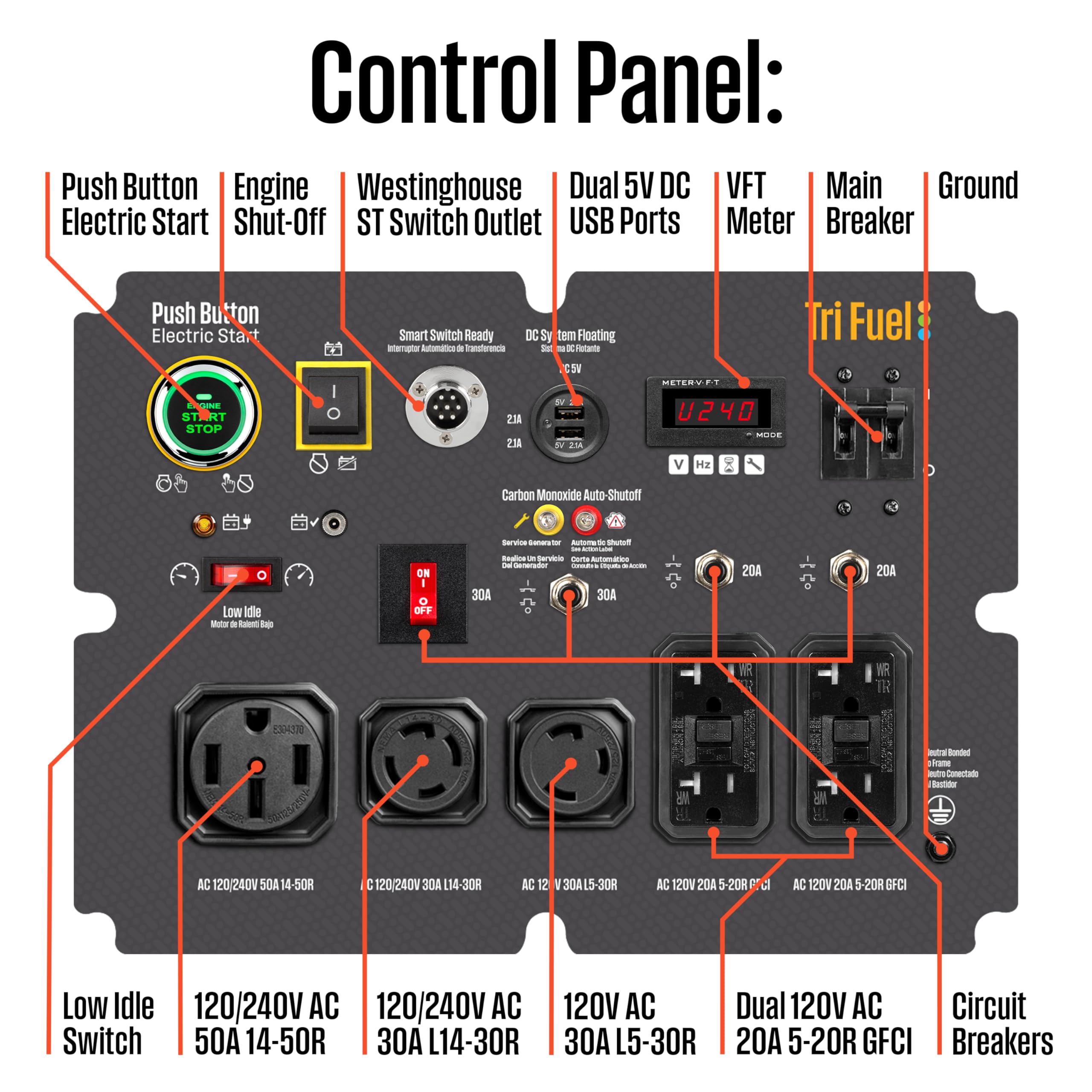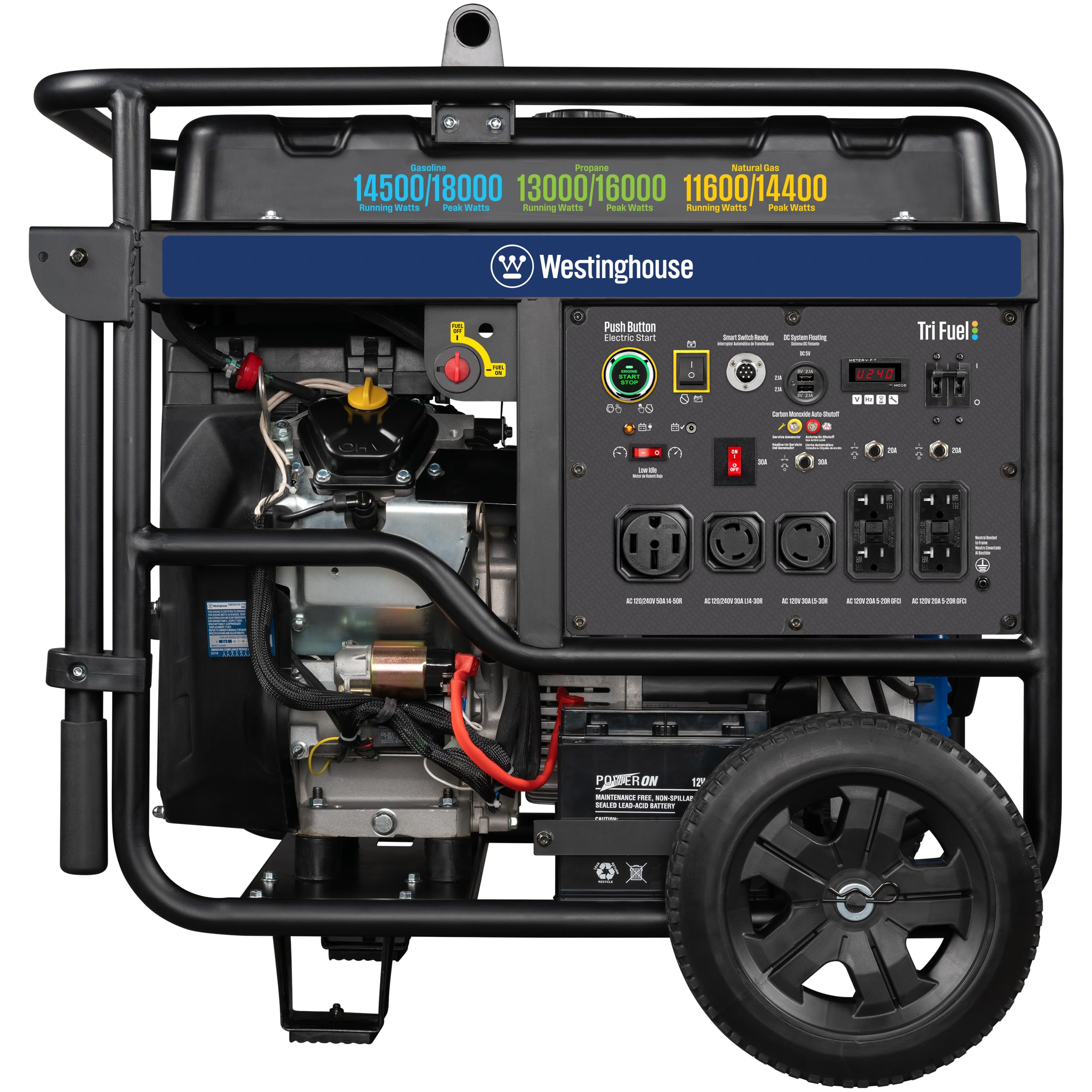 The Westinghouse WGen14500TFc Tri-Fuel Portable Generator with CO Sensor produces up to 14,500 running watts and 18,000 peak watts and operates on gasoline, propane (LPG), or natural gas. The heavy duty 713cc V-Twin 4-Stroke OVH Westinghouse Engine is made of a durable cast iron sleeve and runs for up to 12 hours on a 10.57 gallon (40 L) gas tank, keeping you powered through the day with built-in fuel gauge, automatic low oil shutdown, and GFCI outlets. At less than 5% THD, the WGen14500TFc allows you to safely power sensitive electronics like computers, phones and TVs. Copper windings help the unit produce cleaner power, run cooler and last longer. Push-Button Electric Start makes starting the WGen14500TFc effortless while the remote start key fob offers added ease from a distance. The Transfer Switch Ready L14-30R 30A and larger 14-50R 50A can power your major appliances like the air conditioner, refrigerator and sump pump as well as any lights or entertainment centers at the same time with a single cord hookup. The Digital Data Center displays volt output, frequency, and lifetime hours to keep you up to date with real-time information and regular maintenance. Conveniently portable with included heavy duty never-flat wheels, handle, and lift bracket, it'll have your house, travel trailer or jobsite powered in seconds. The WGen14500TFc is complete with a 3-Year Limited Warranty and Lifetime Technical Support backed by our nationwide customer service and support network.