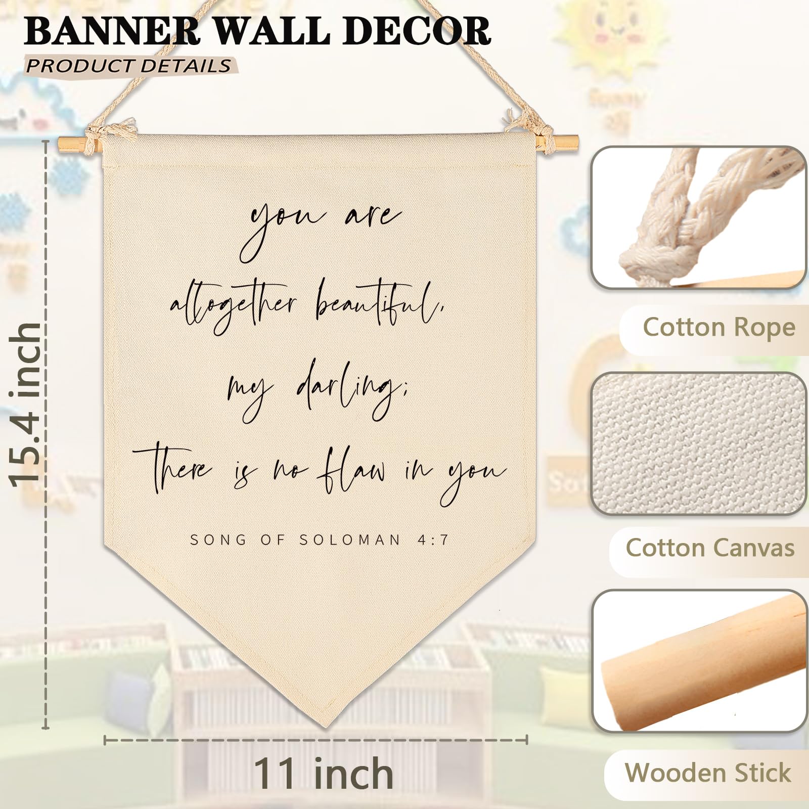 Crafted from natural cotton canvas, this 15.4 x 11 inch nursery wall banner brings a soft and calming touch to baby room, toddler space. The durable fabric keeps its shape with a natural texture, while the clear print stays bright with everyday use. Lightweight and easy to hang, it comes with a wooden dowel and pre-tied twine for quick setup on walls, doors or shelves. The versatile size fits small spaces without feeling crowded, making it perfect for creating a cozy nursery atmosphere. A thoughtful gift for baby showers, newborn arrival or first birthday.