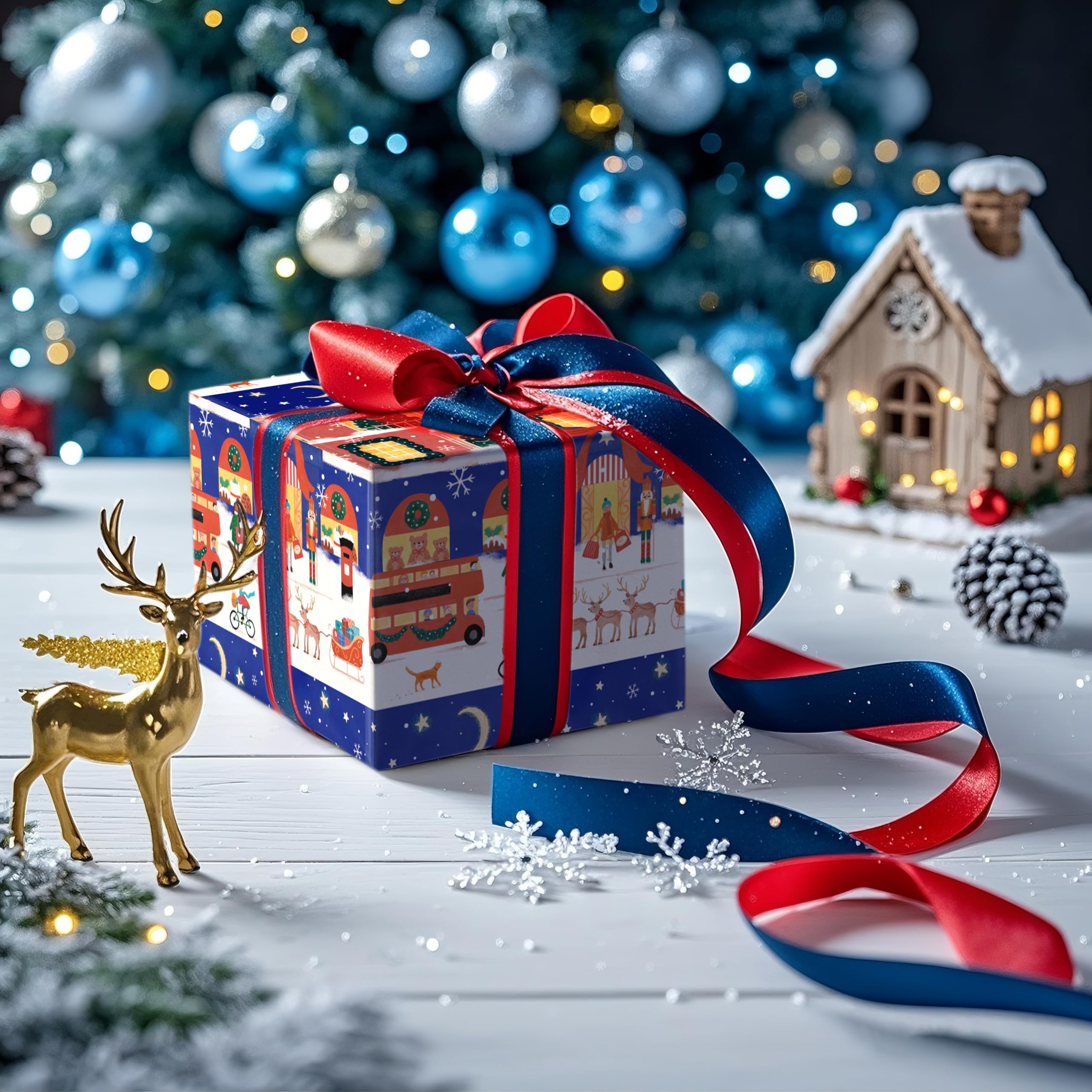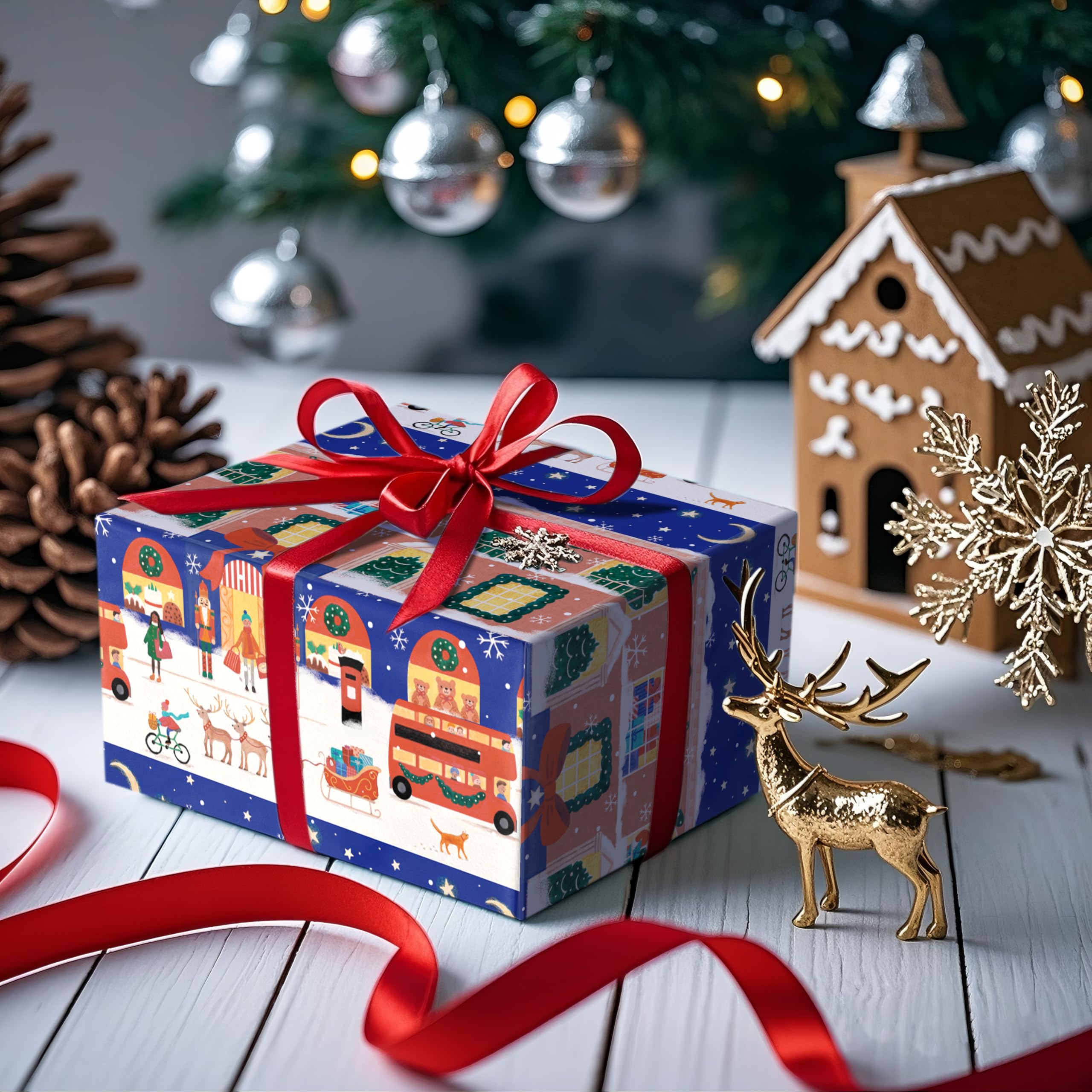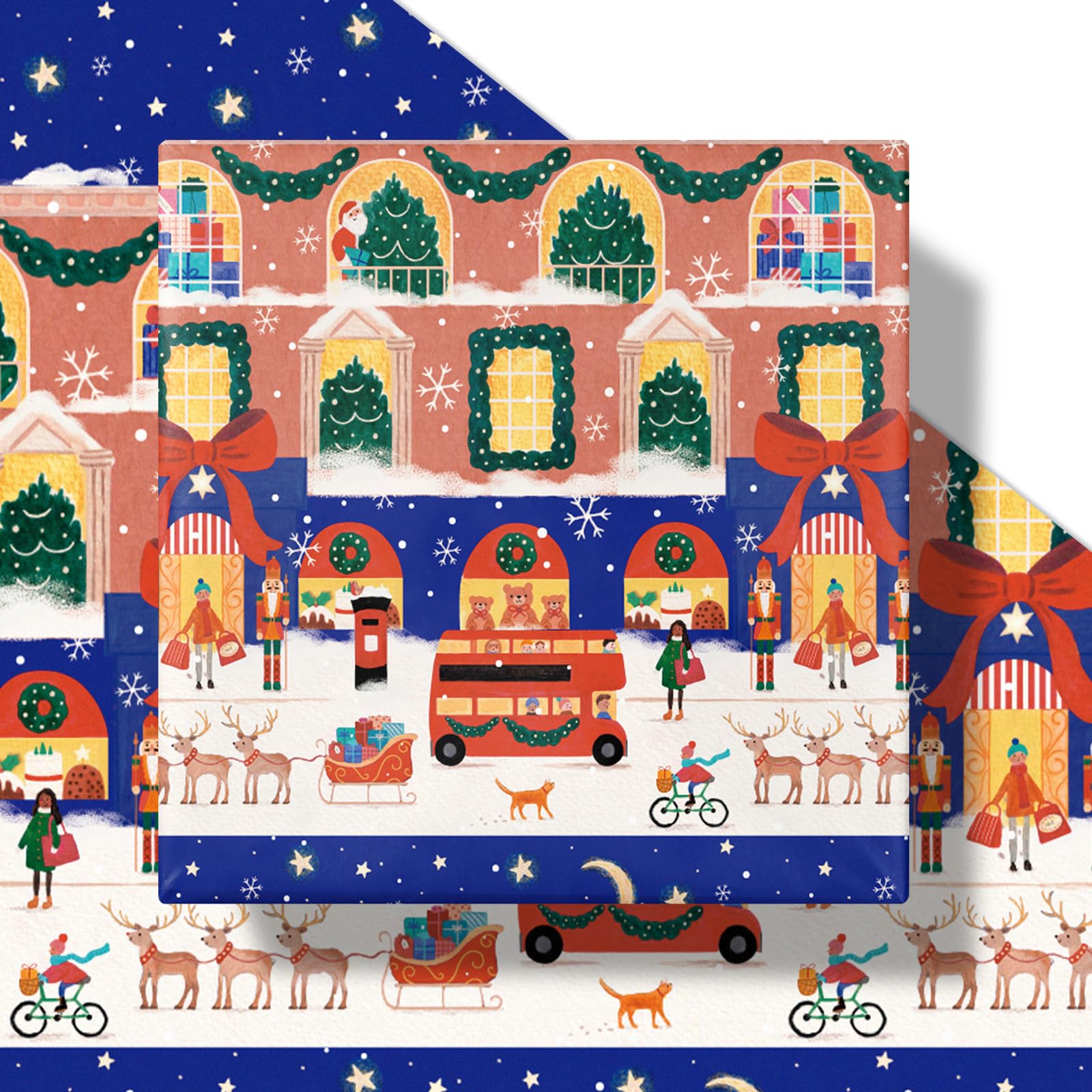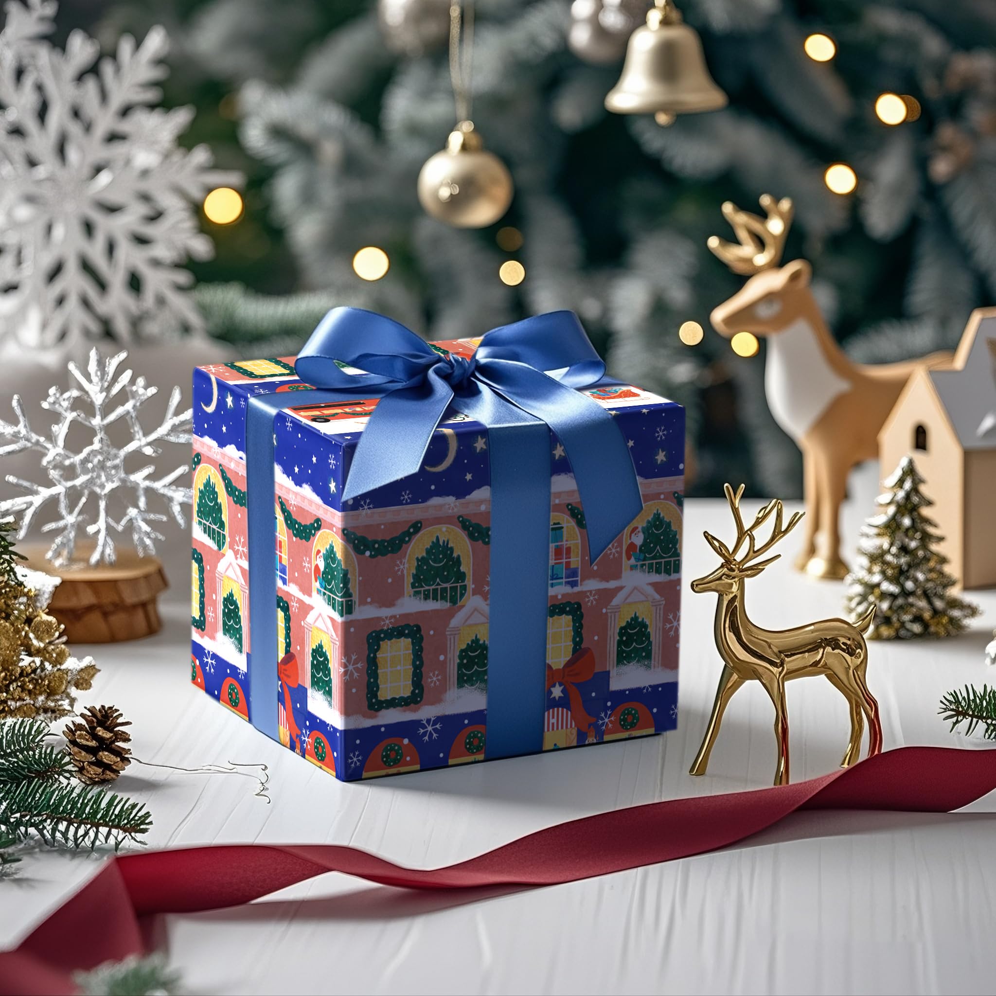 Step into a whimsical Christmas town with the LeZakaa Christmas Wrapping Paper Mini Roll, featuring a hand-illustrated holiday street scene filled with festive storefronts, snow-covered windows, decorated Christmas trees, nutcracker guards, and gifts galore. With a size of 17 inches x 16.4 feet, this mini roll is great for wrapping smaller items or accenting gift baskets. Made of premium coated paper, it's sturdy yet smooth, making wrapping neat and easy. Whether you’re wrapping for kids, adults, or just want a charming and decorative touch under your tree, this paper brings the holiday spirit to life.