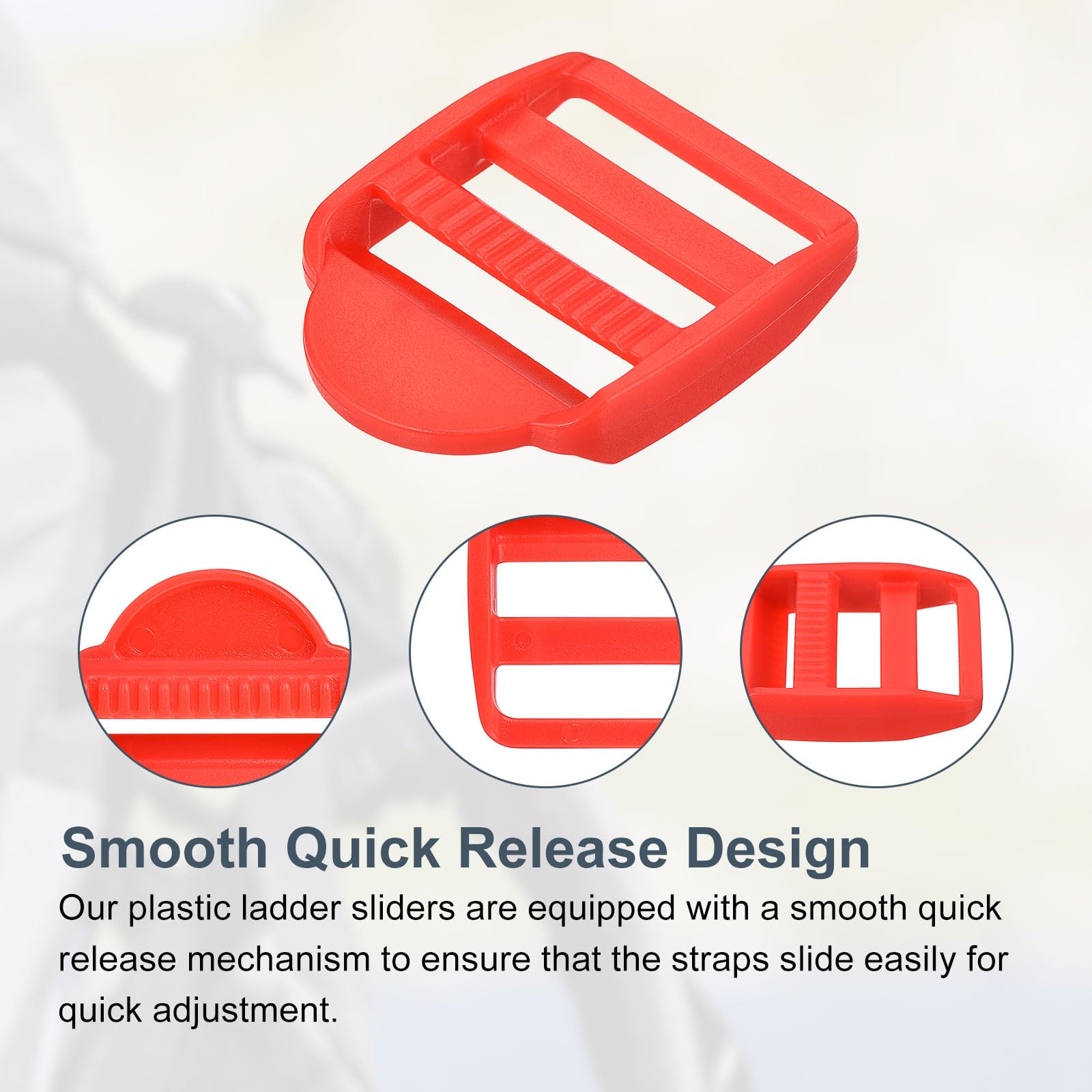 Description Description: Durable Material: These ladder sliders are made of POM plastic, which is lightweight and durable, waterproof and wear-resistant, and will not age easily even after long-term outdoor use. Smooth Quick Release Design: Our plastic ladder sliders are equipped with a smooth quick release mechanism to ensure that the straps slide easily for quick adjustment, and a variety of beautiful colors can match various styles of backpacks. Easy to Use: No tools are required, just pass the webbing directly through the plastic buckle to complete the installation, providing a firm and reliable fit. Application: The adjustable lock buckle can be used as a DIY decorative piece for backpacks, and is also used to replace or repair nylon straps and belts. It is very suitable for straps, belts, wallets, yoga mat, backpacks and luggage, providing versatility and reliability.