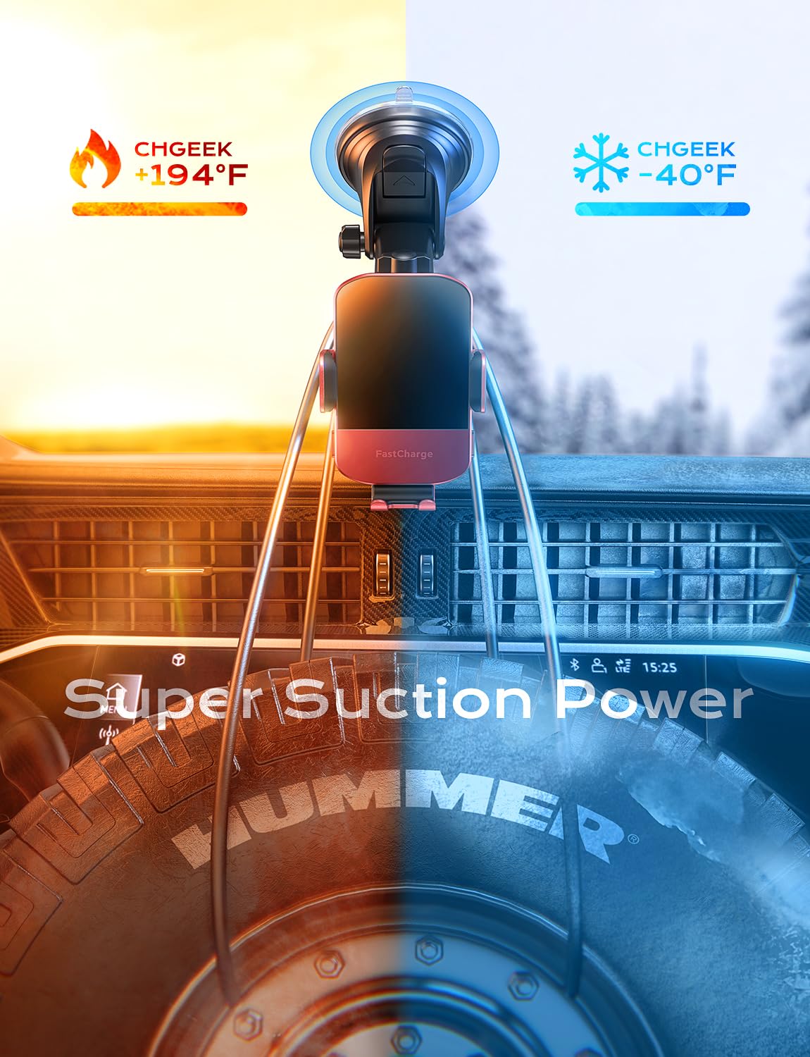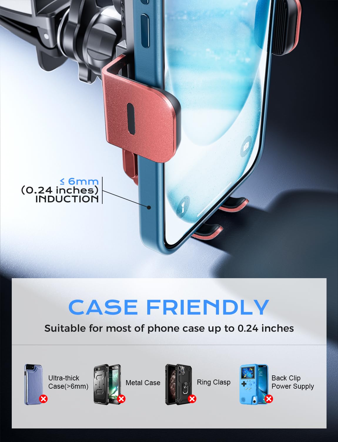 【Case Friendly & Flexible Angle Adjustment】Enjoy hassle-free charging through phone cases up to 6mm thick with our CHGeek phone holder for car. Please note that metal cases, magnets, credit cards, grips, and stands may interfere with charging. For optimal viewing and safe driving, the 360° rotating sphere and retractable & foldable bracket allow you to adjust the angle to your preference
