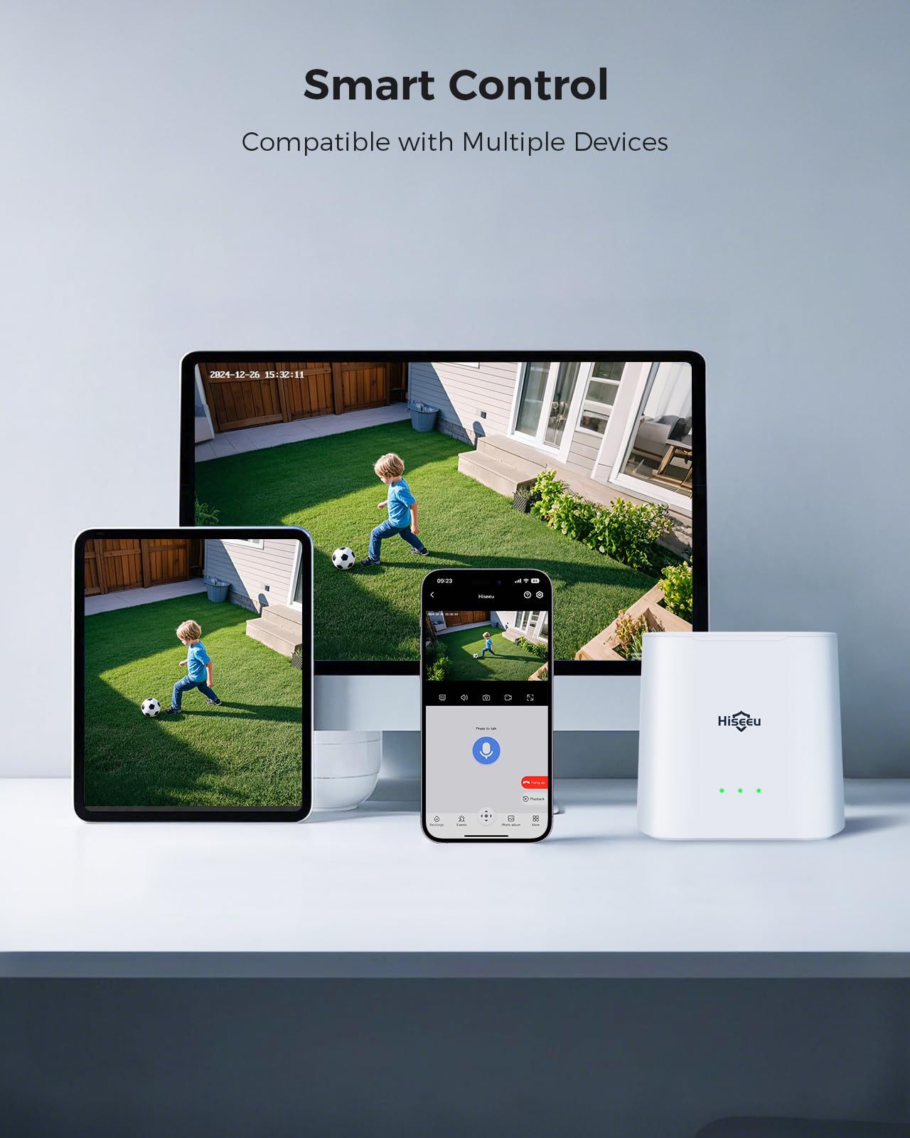 Control Anywhere, hiseeu solar cameras outdoor works compatible with most smart devices as phone, PC, TV monitor, Base-station. Support local(for NVR or Base-station, no need Wi-Fi) & remote view and control. Your house, your rules.