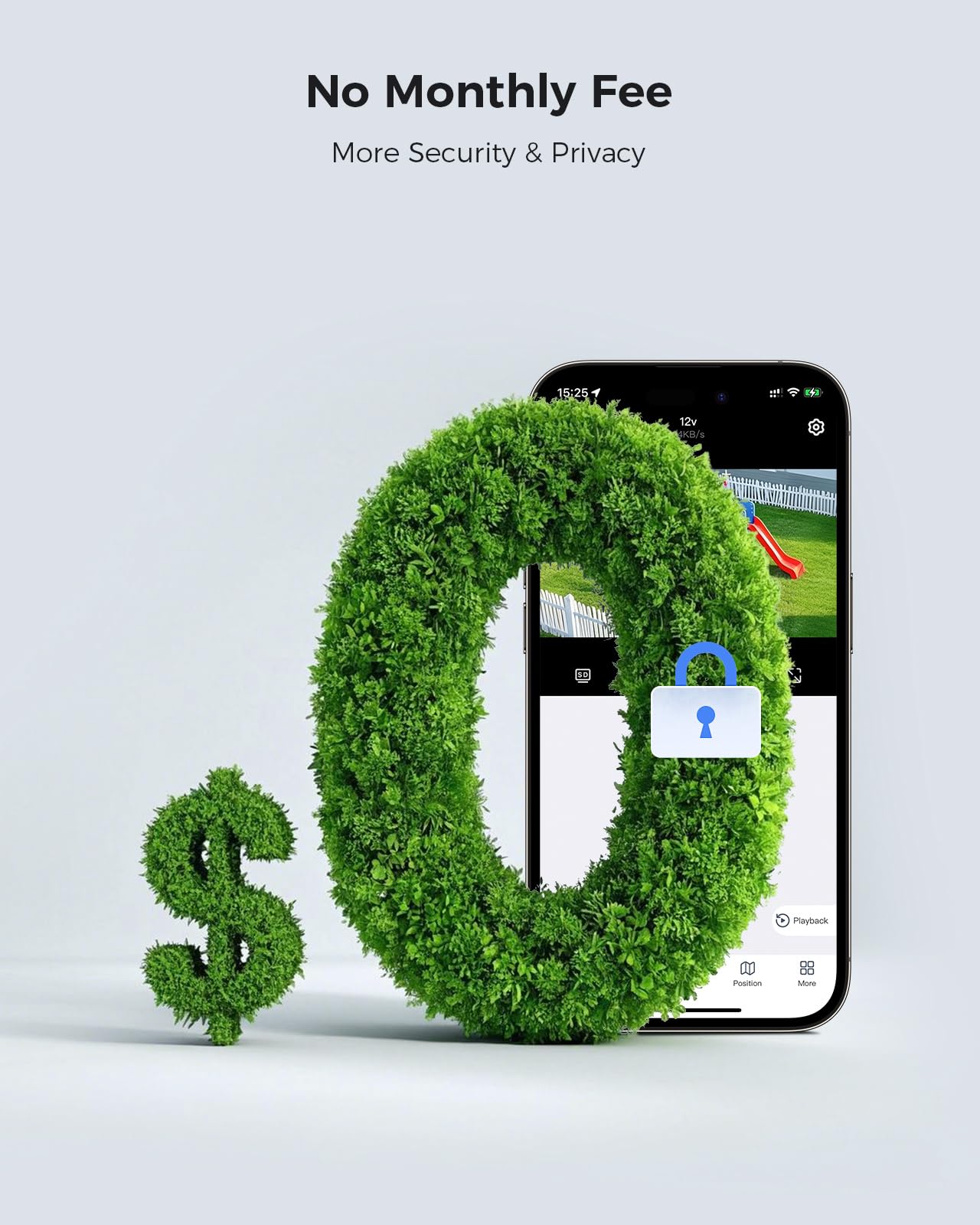 No Monthly Fees, store footage locally on a memory card (64G). Own your data, the money saved for buying a little gift for your kids/families every month.