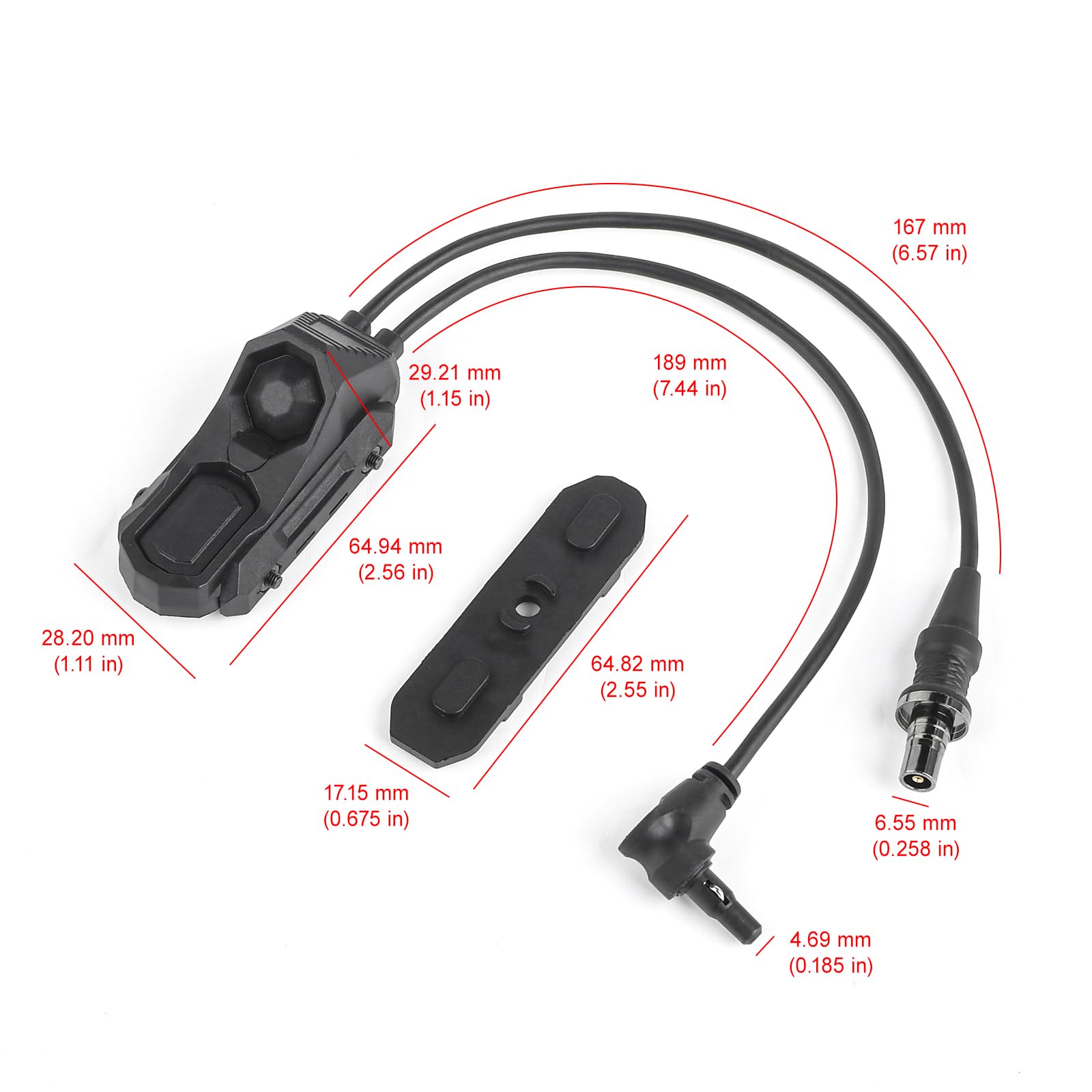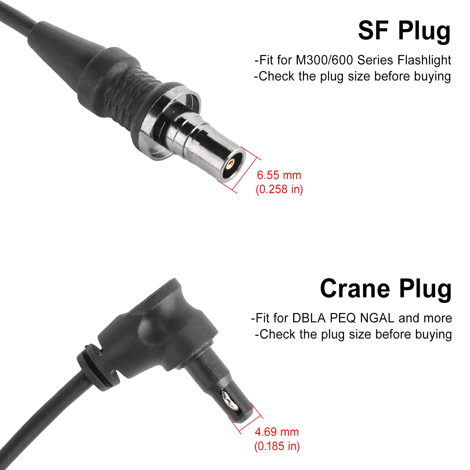 Wire controlled remote pressure switch with SF + crane plug. SF plug is suitable for general M300 M600 light tactical flashlights, etc. Crane plug is suitable for PEQ DBAL NGAL series, etc. Please carefully check whether the plug diameter is suitable