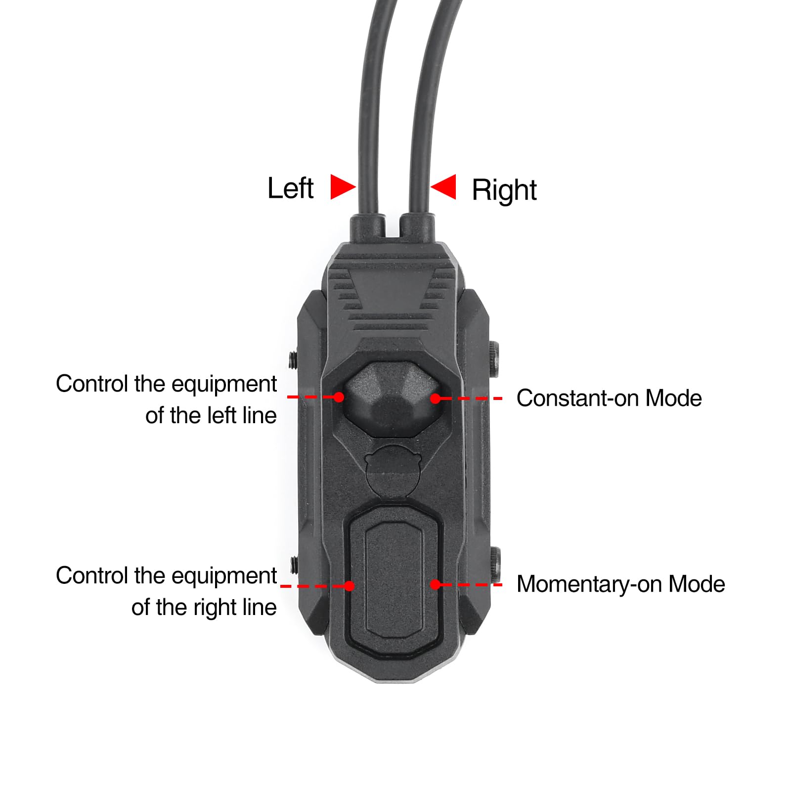Modular button dual pressure switch, double buttons double functions, control momentary-on and constant-on modes respectively. When lightly press the button switch which control constant mode, it can also be momentary-on mode