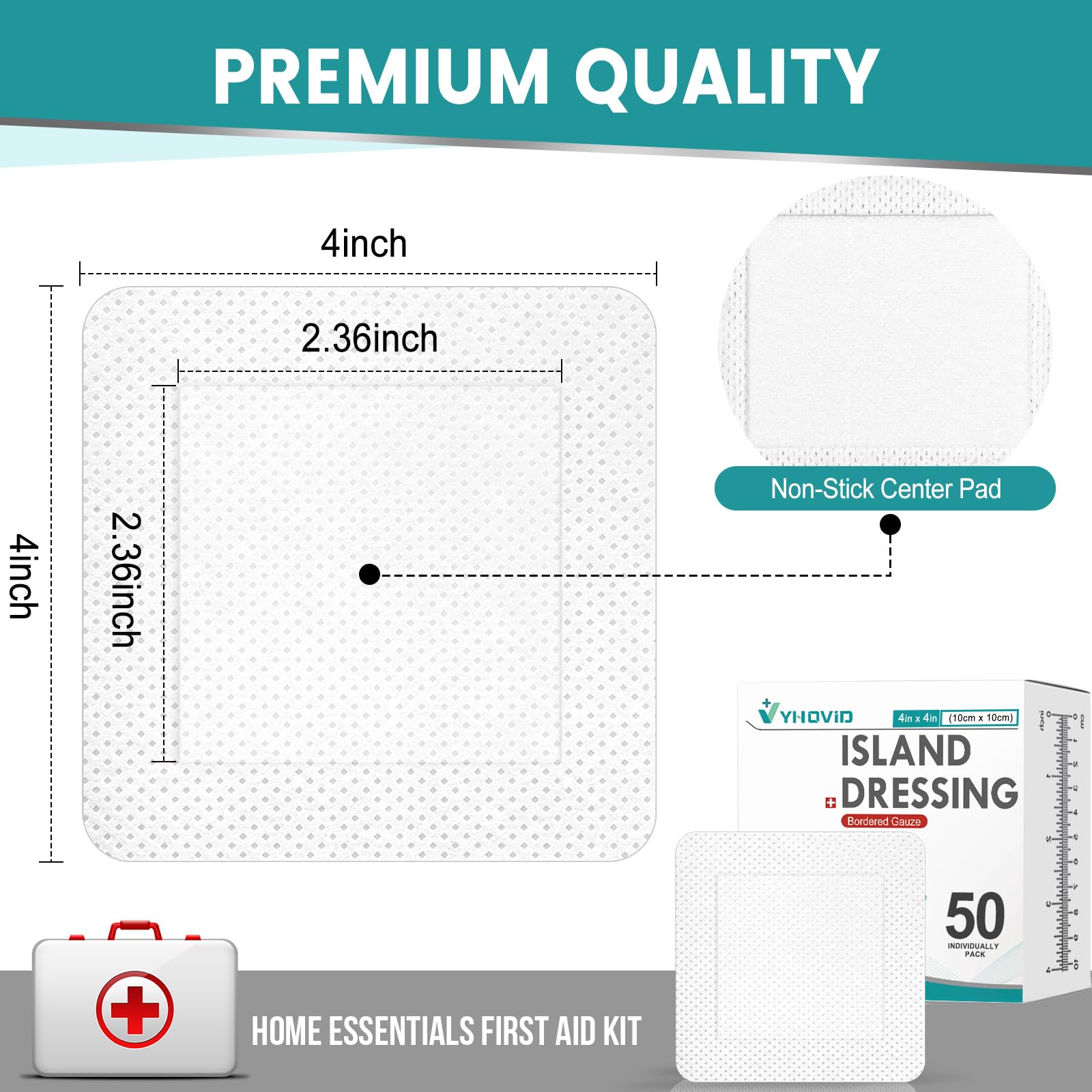 Individually Packed: The island dressing is individually wrapped. The size of the island dressing is 4" x 4", including the adhesive border and center pad. Bordered gauze is comfortable and convenient, making it suitable for a home first aid kit or a day bag.
