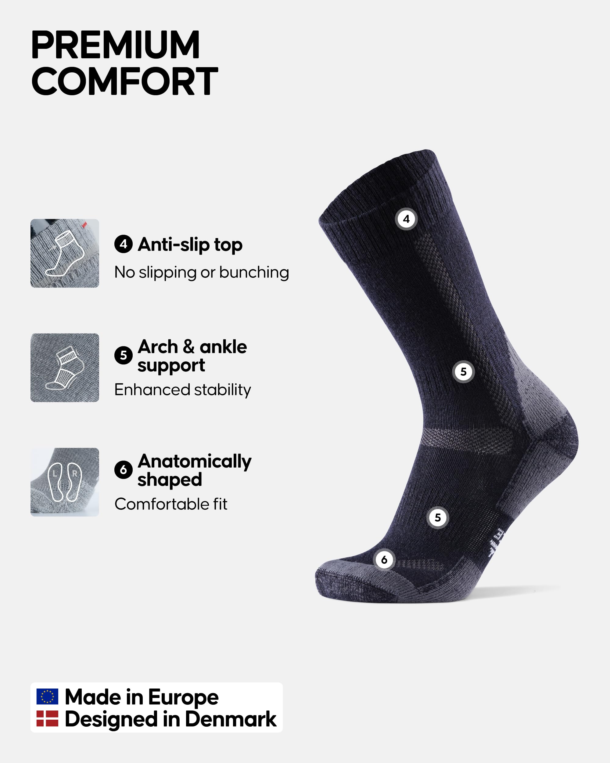 Comfort & Protection: Heavy anti-blister cushioning reduces friction and foot fatigue, while arch support adds stability. Merino wool’s natural properties make these thick winter socks odor-resistant for lasting freshness
