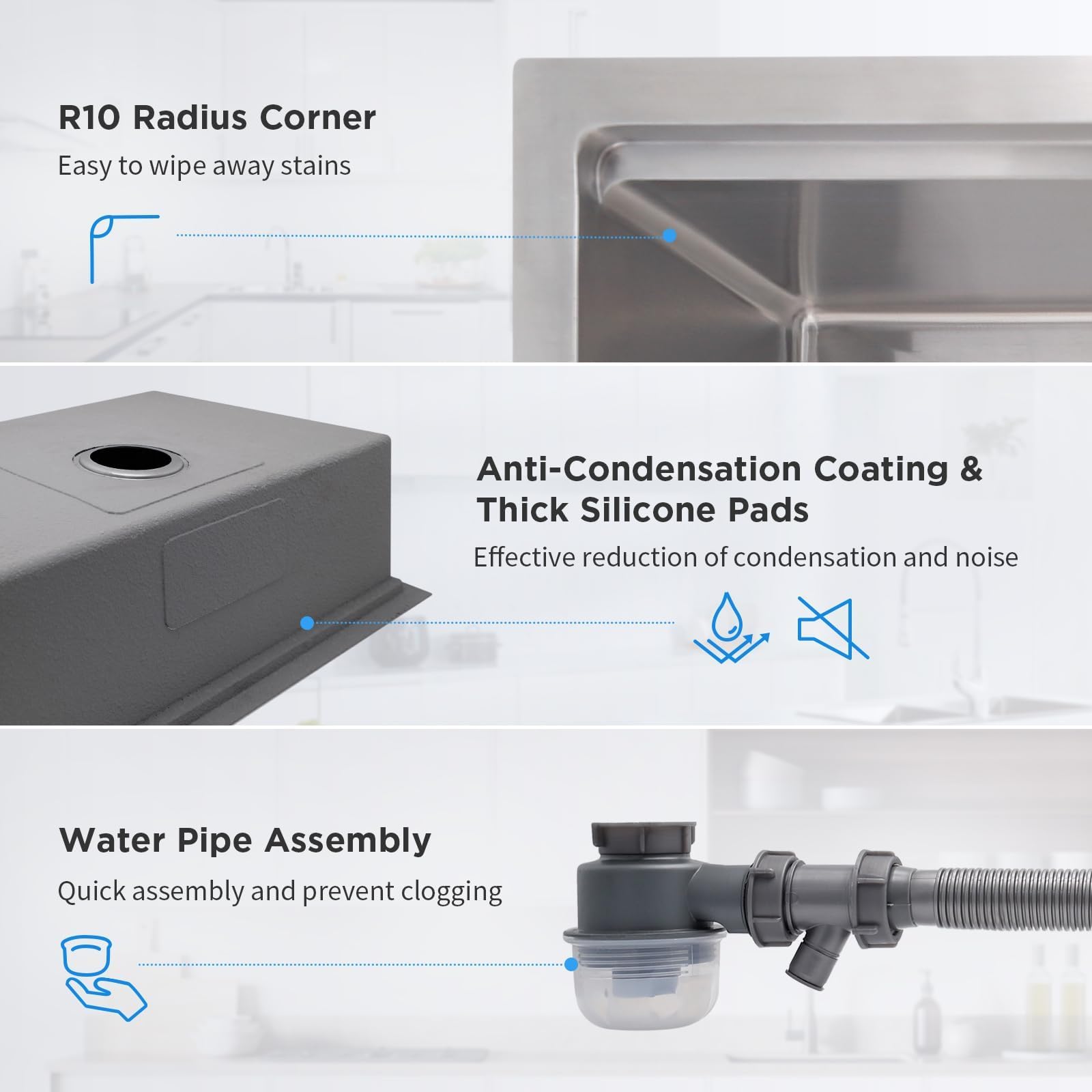 PRACTICAL PERFORMANCE: R10 radius rounded corners for easy wiping of sinks; Anti-condensation coating reduces condensation and prevents moisture buildup; Thick silicone pads reduce noise and sound; The openable lid at the top of the pipe stops food debris from clogging the pipe opening. For everyday meal preparation or hosting a great party, this kitchen sink is a functional, intelligent kitchen must-have.
