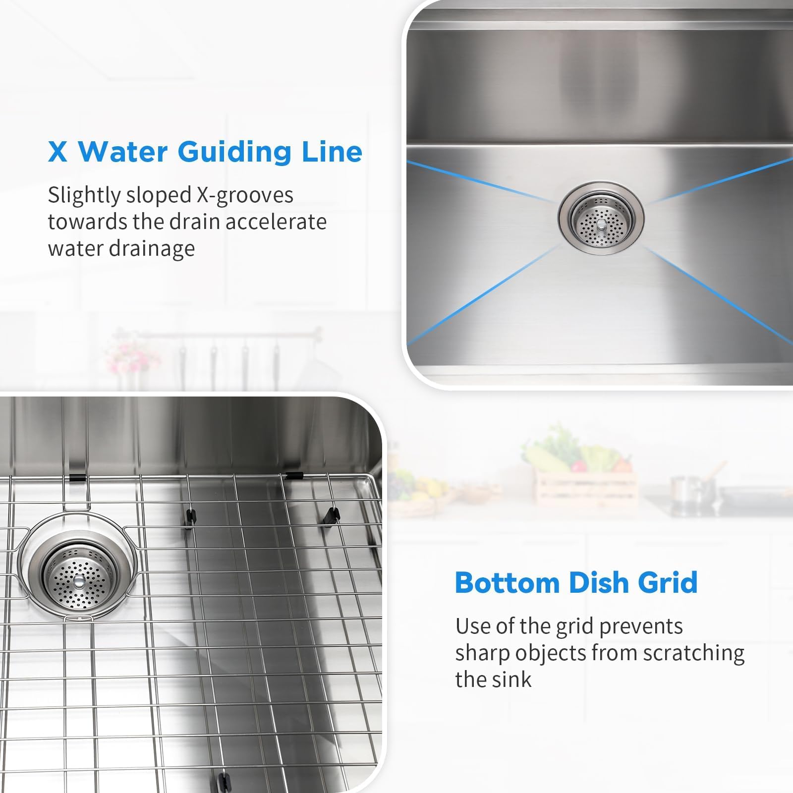 FASTER DRAINING DESIGN: The undermount kitchen sink has X-shaped drain grooves on the bottom that slope gently towards the drain for quick drainage and prevent water from pooling, keeping the work area clean. The sink also has a bottom grid that shields the deep sink surface from scratches and allows water to flow beneath for optimal drainage when rinsing items.