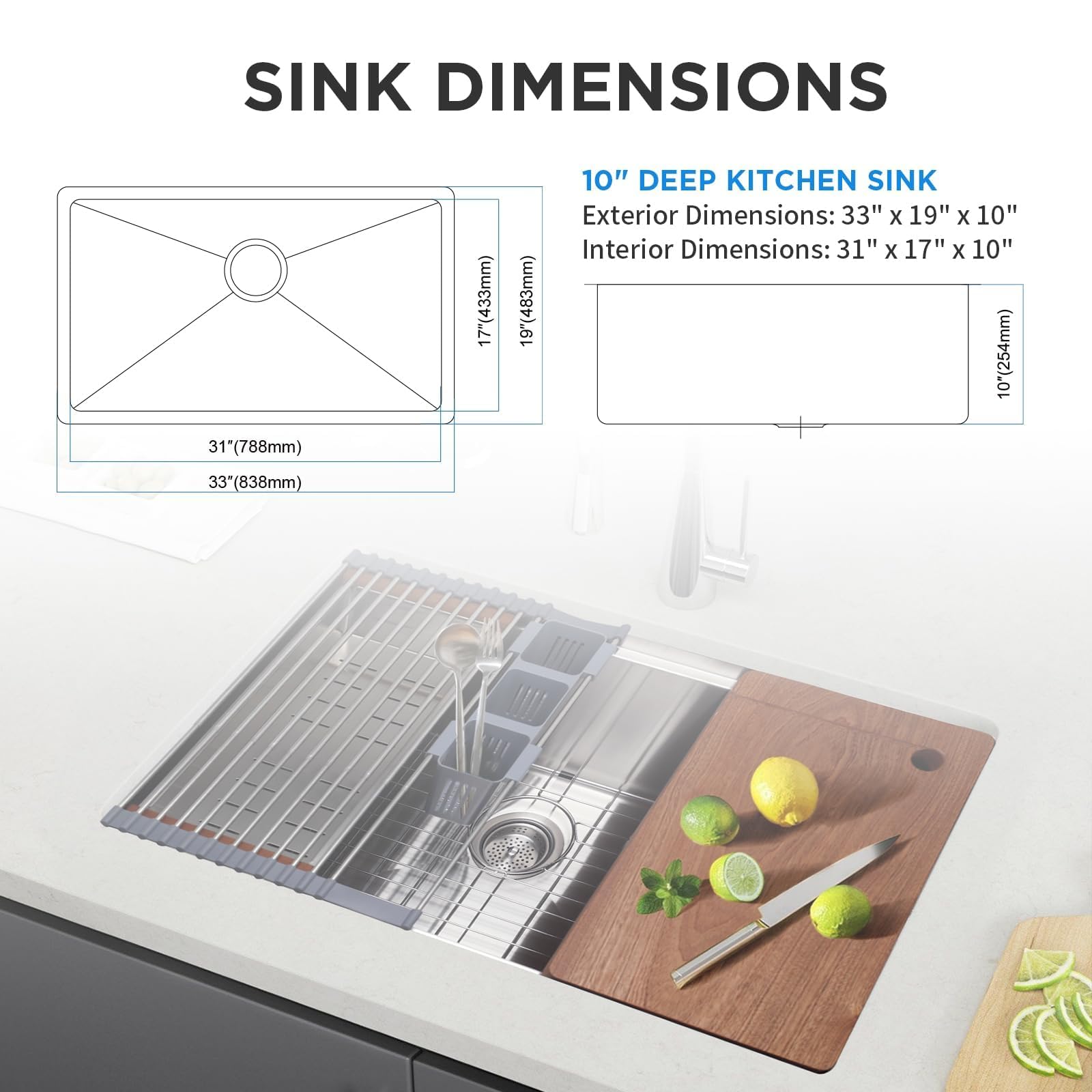 33 INCH WORKSTATION KITCHEN SINK: 33" (wide) x 19" (length) x 10" (depth). The drop-in kitchen sink's exterior design ensures a modern and elegant aesthetic while maximizing the available space to accommodate large dishes pots and pans.