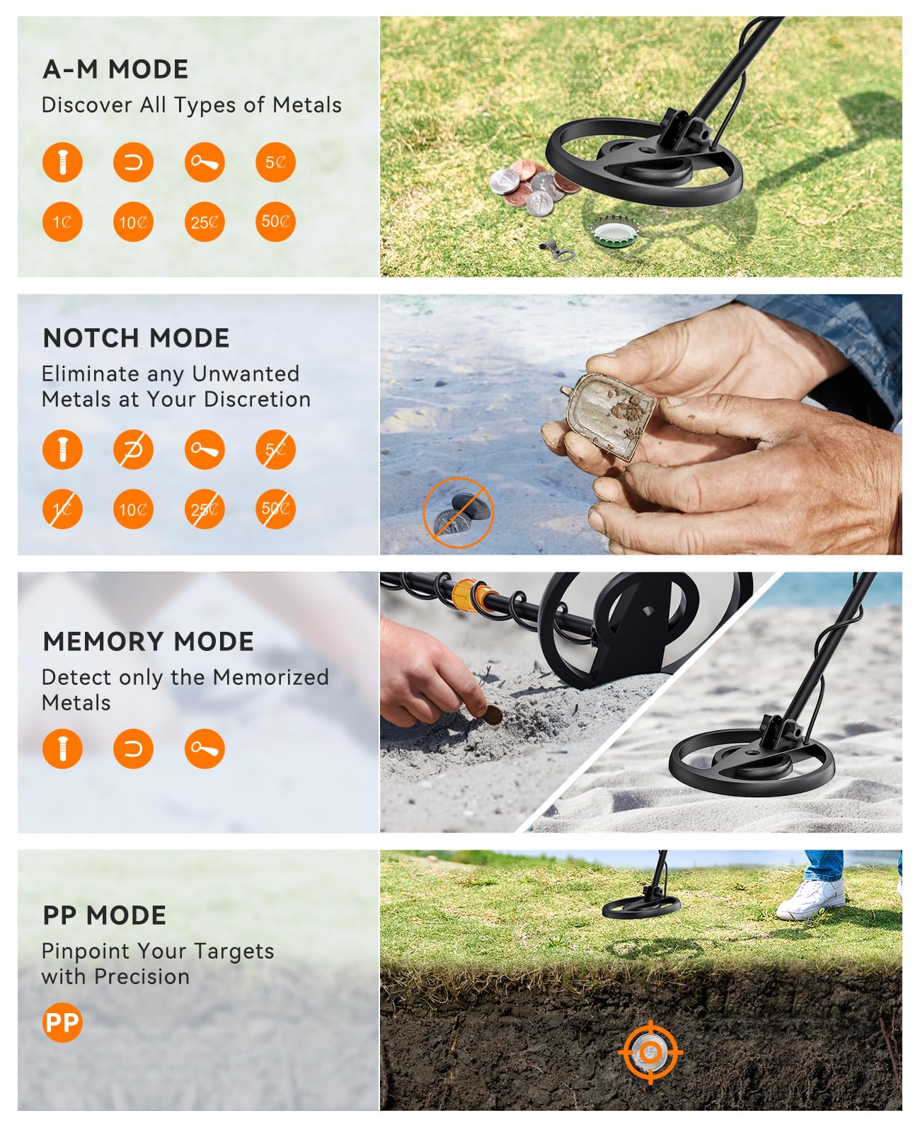 【4 Strong Detection Modes】The metal detectors have 4 different metal detection modes. ①All metal mode: Discover all types of metals. ② Notch mode: Eliminate any Unwanted Metals at Your Discretion. ③Pinpoint mode: It can locate the target more accurately. ④ Memory mode: Detect the only memorized metal.