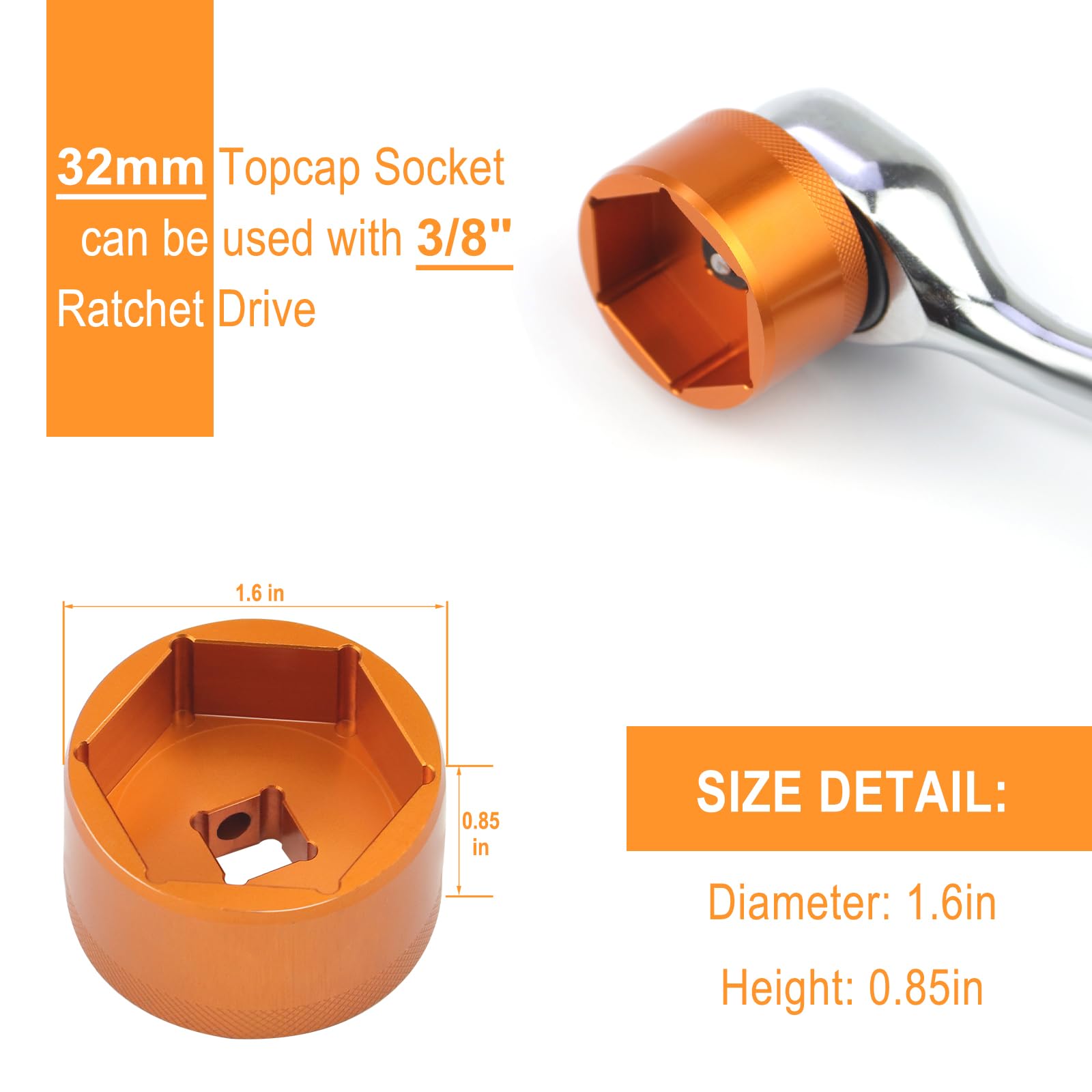 - 32mm Topcap Socket can be used with 3/8" Ratchet Drive.