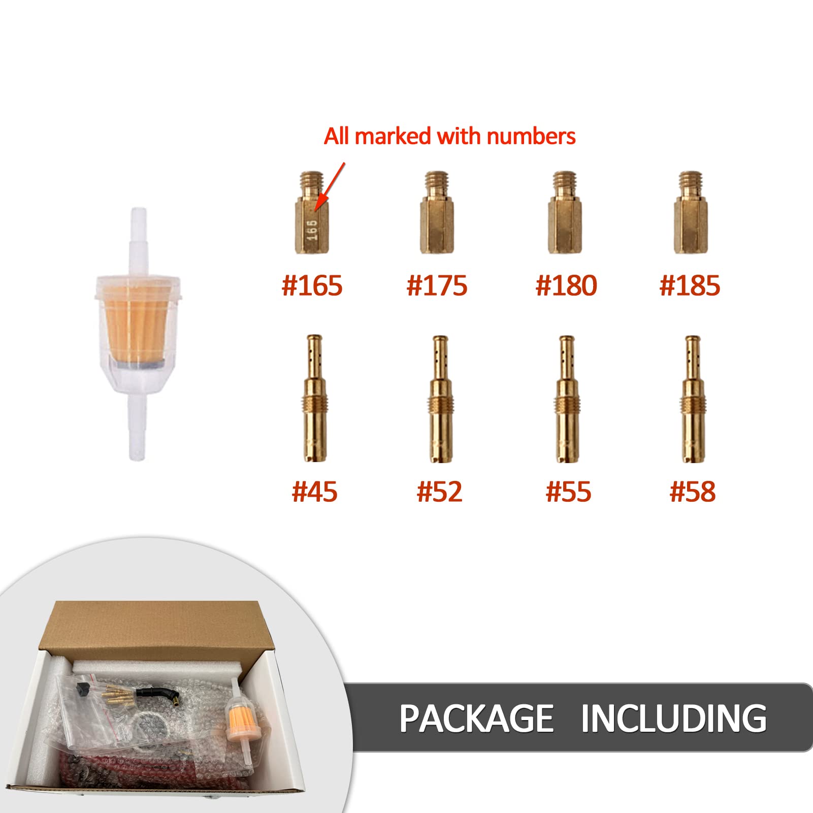 Package: carburetor, fuel filter, extra main jets #165 175 180 185, extra pilot jets #45 52 55 58.