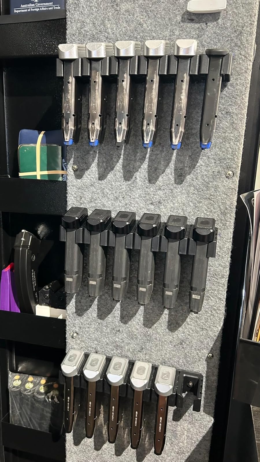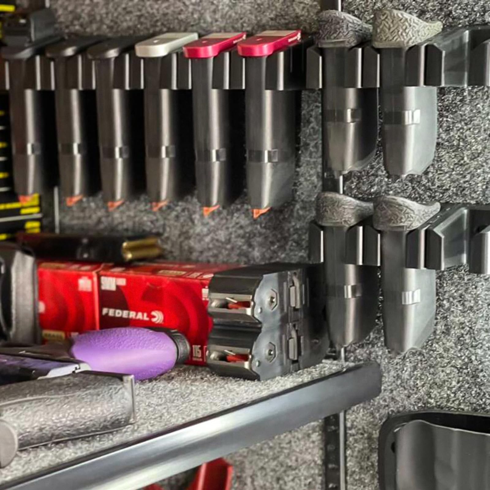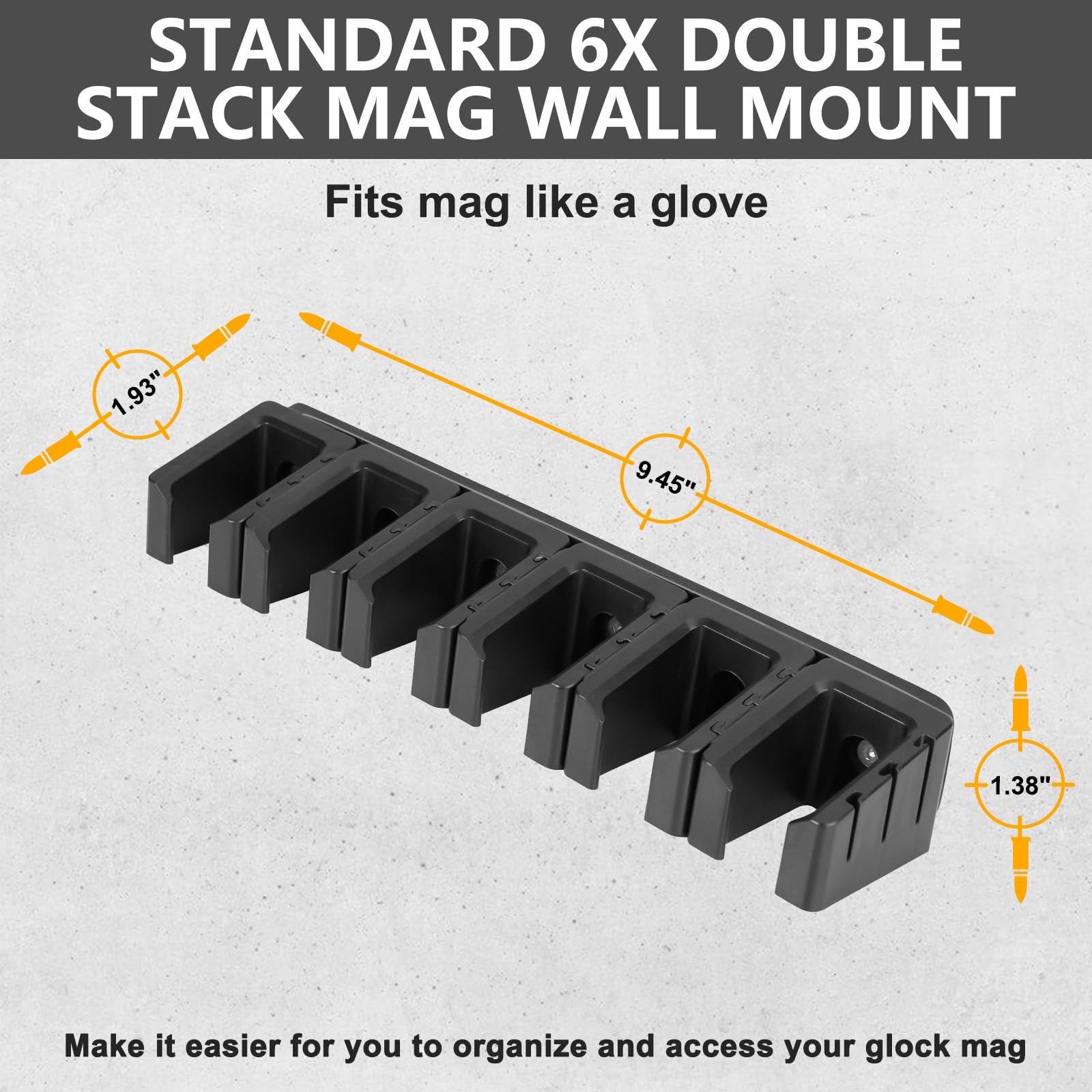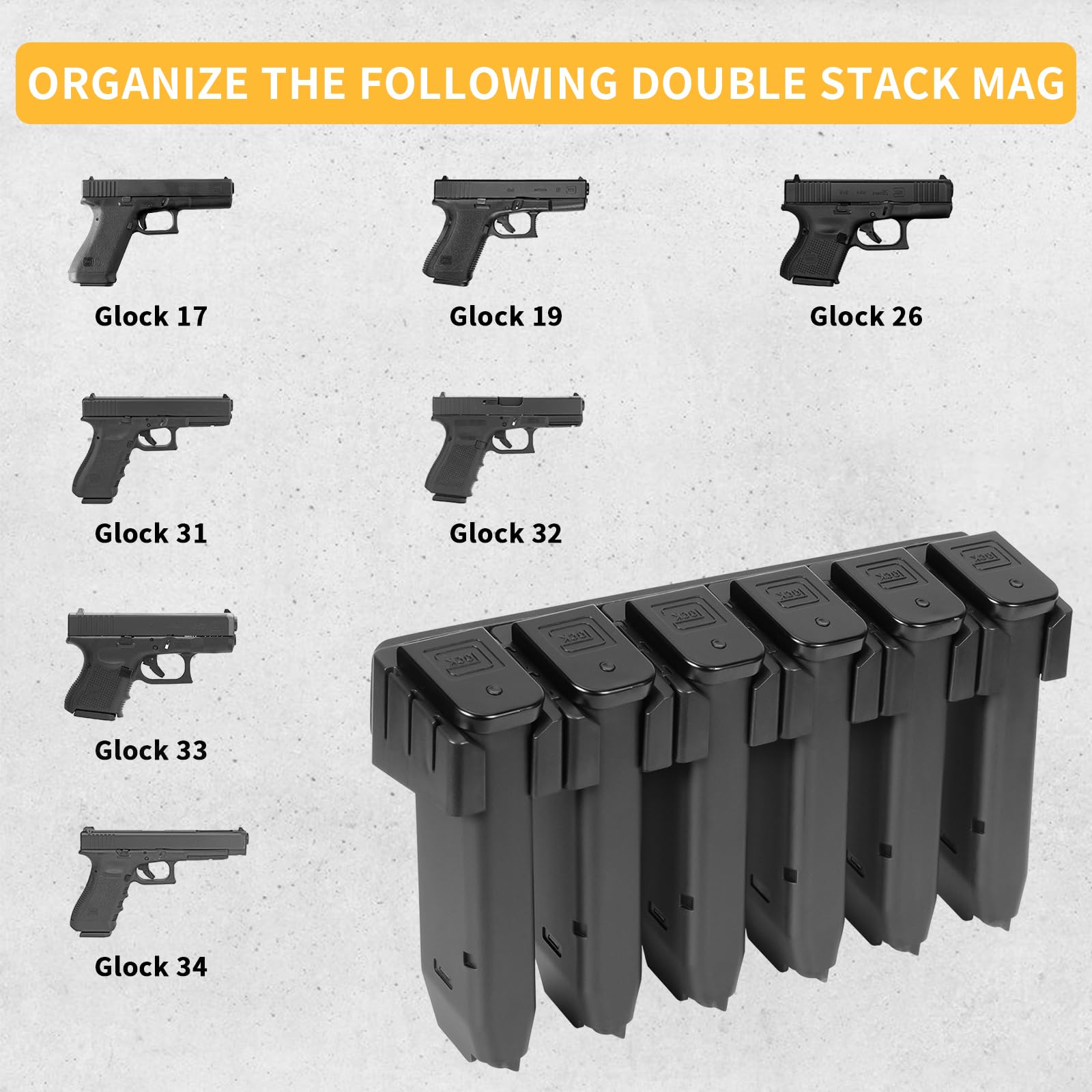 HOLDS DOUBLE STACK MAG VERY SNUGGLY - Hundreds of fit tests by product engineers for the magnetic pistol wall mount are an excellent solution for organizing and displaying your handgun mags. Fits Glock 17 19 26 31 32 33 34 snug and lines up perfectly.