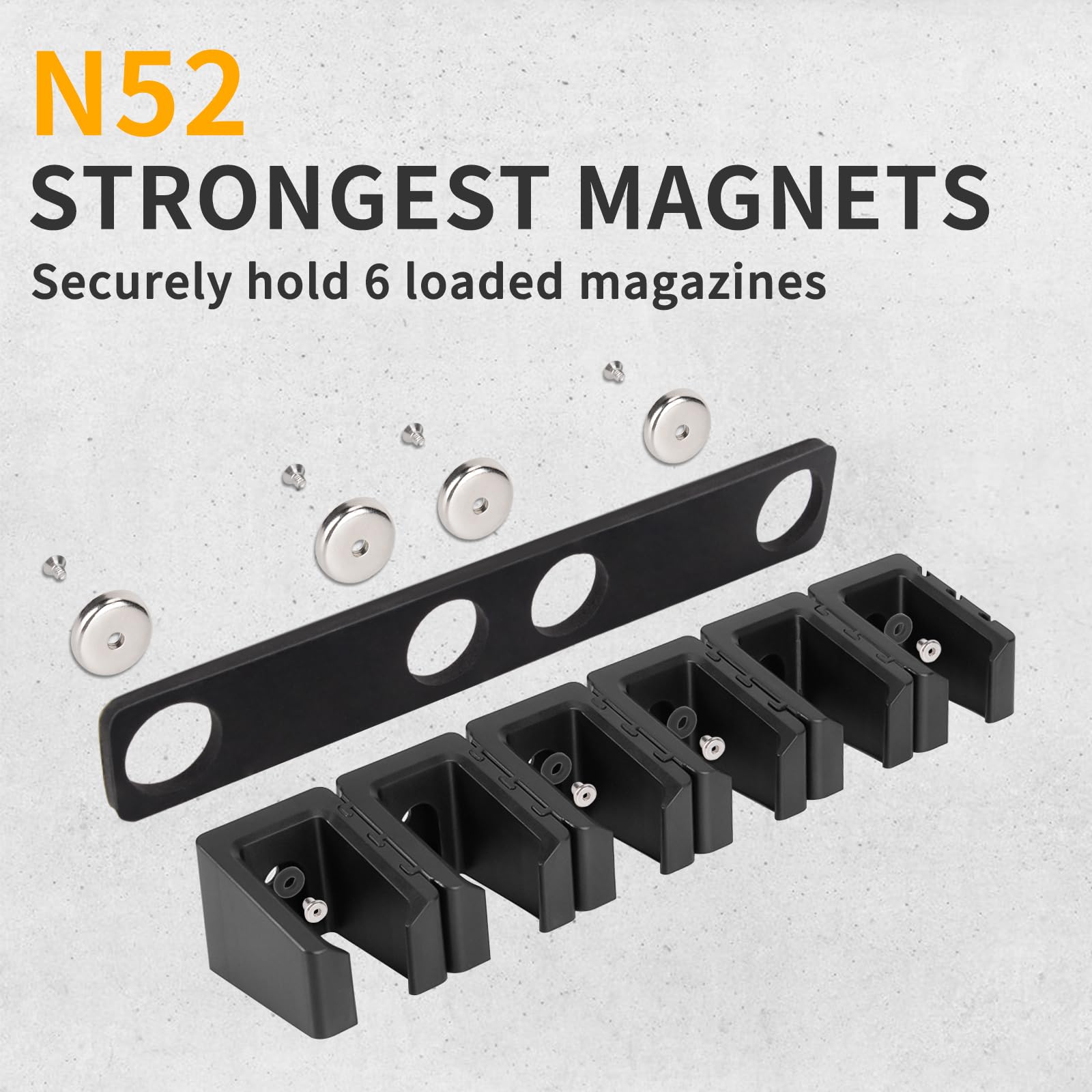 STRONG MAGNETIC ATTACH - The back of the Glock magazine holder has very strong N52 magnets recessed into rubber and provides good attachment to flat steel surfaces. Magnets are more than strong enough to hold fully loaded, with no sliding once installed. (Make sure not to have your fingers between the metal surface and the mount!)