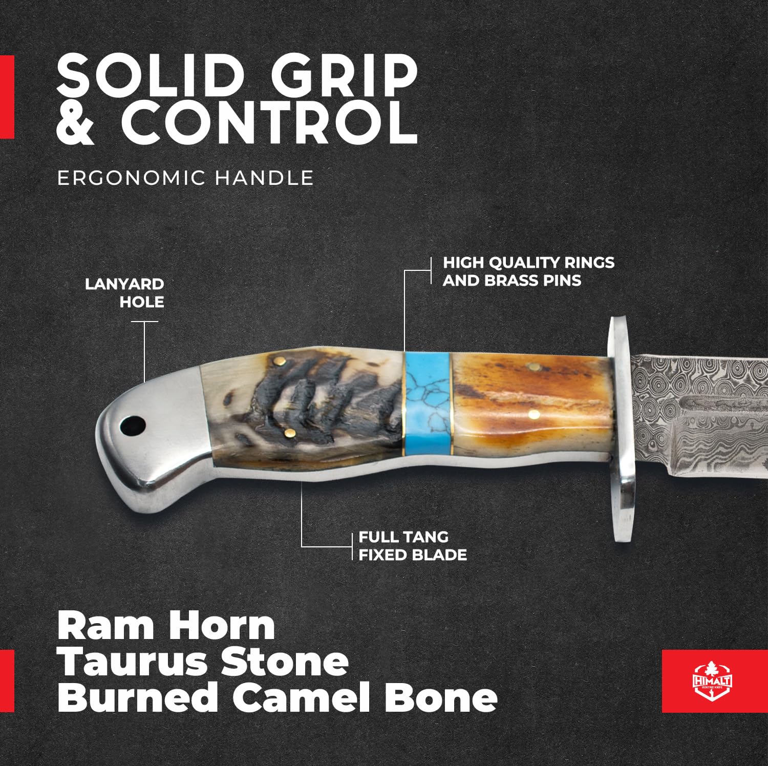 Ergonomic Hand Grip : Himalt's Damascus steel knife features an ergonomically carved handle from Ram horn ,camel bone & turquoise stone , offering a secure and comfortable grip.