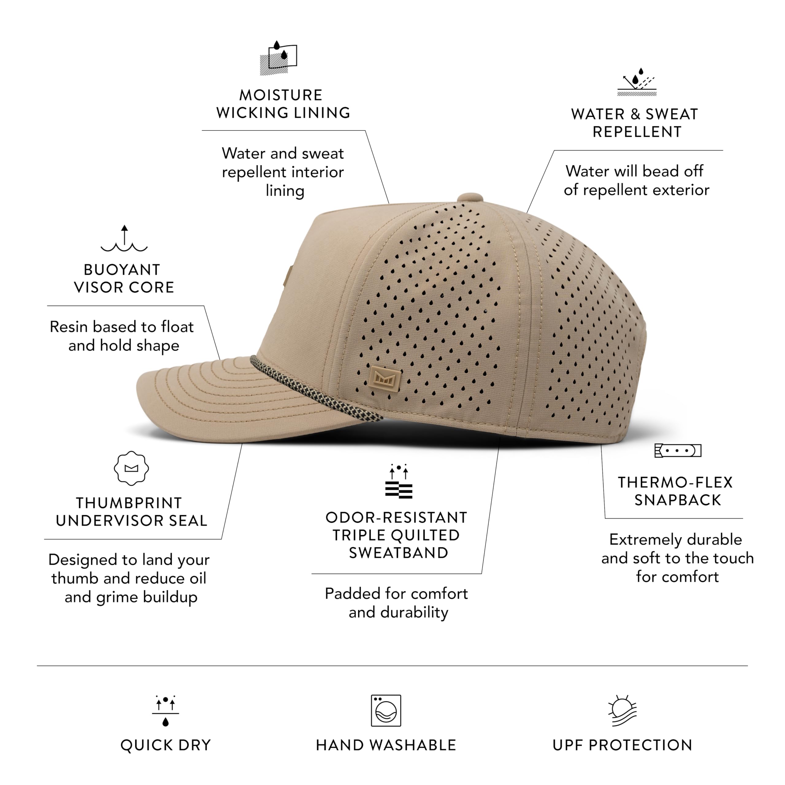 PERFORMANCE SNAPBACK HAT: Exterior crown has hydrophobic crown panels, laser-perforated side & rear panels for breathability, and adjustable snapback closure. Visor has rope feature, hydrophobic exterior, water capable core, and signature under visor seal