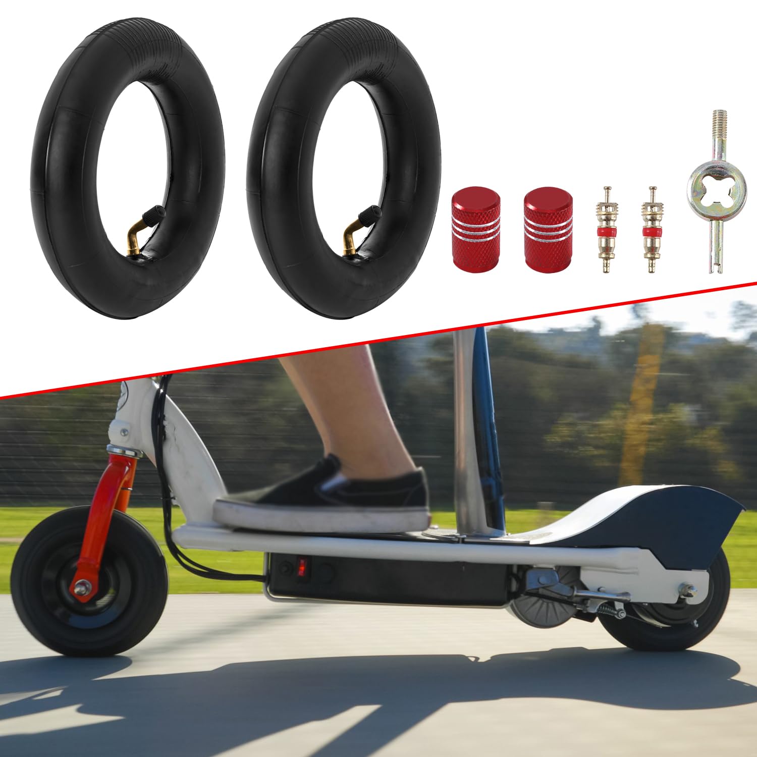 Package Including : 200X50 Inner Tube x 2, Valve Core Wrench x 1, Brass Valve Stem Cores x 2, Red Stem Valve Caps x 2.