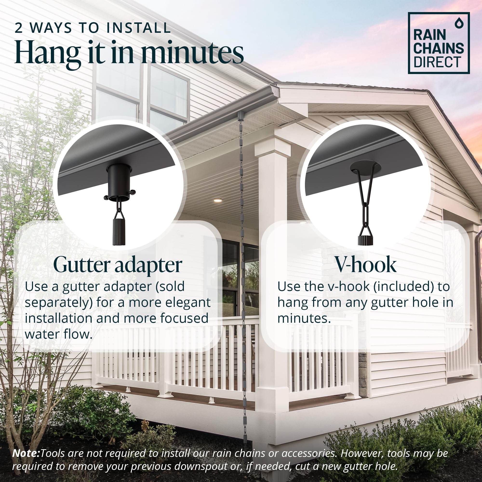Install in a Snap - No need to be an expert. Easily swap your rain chains for downspouts using the supplied hanging hook. Our rain chains for outside are compatible with any standard gutter hole. Optional gutter installer sold separately.