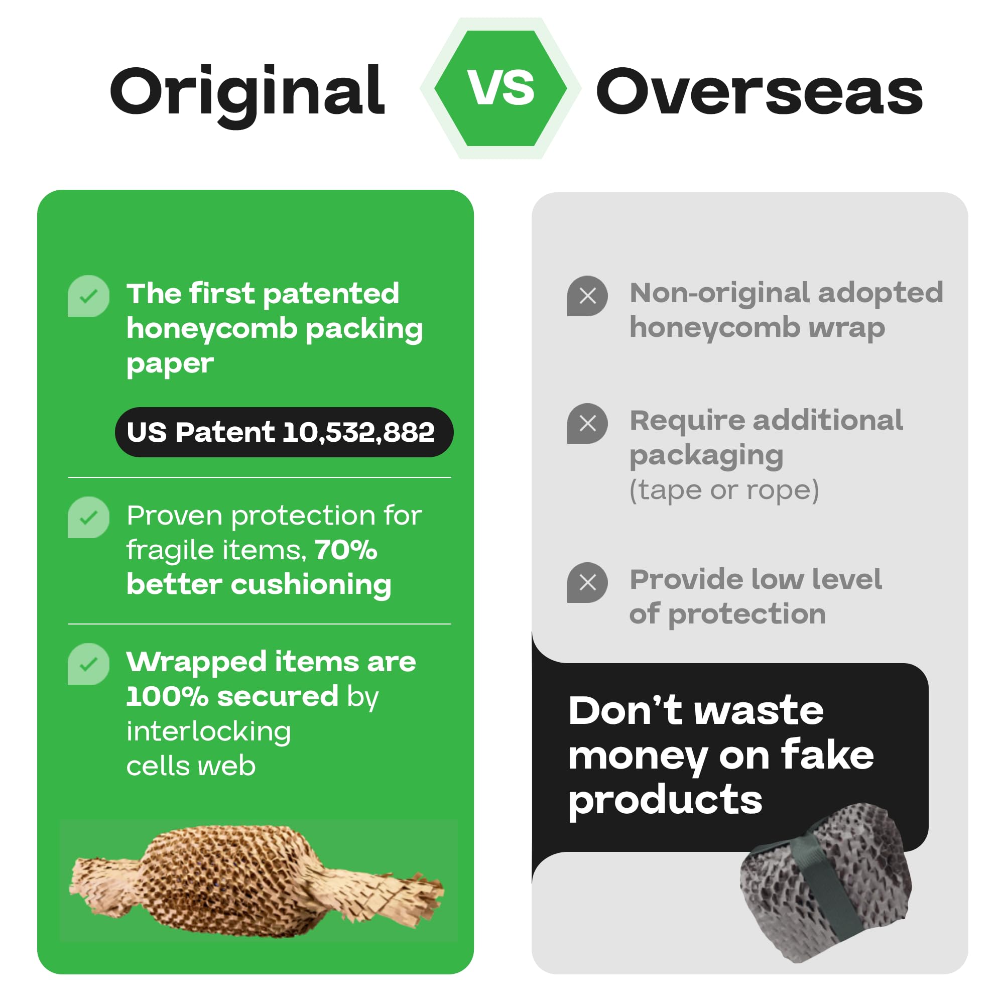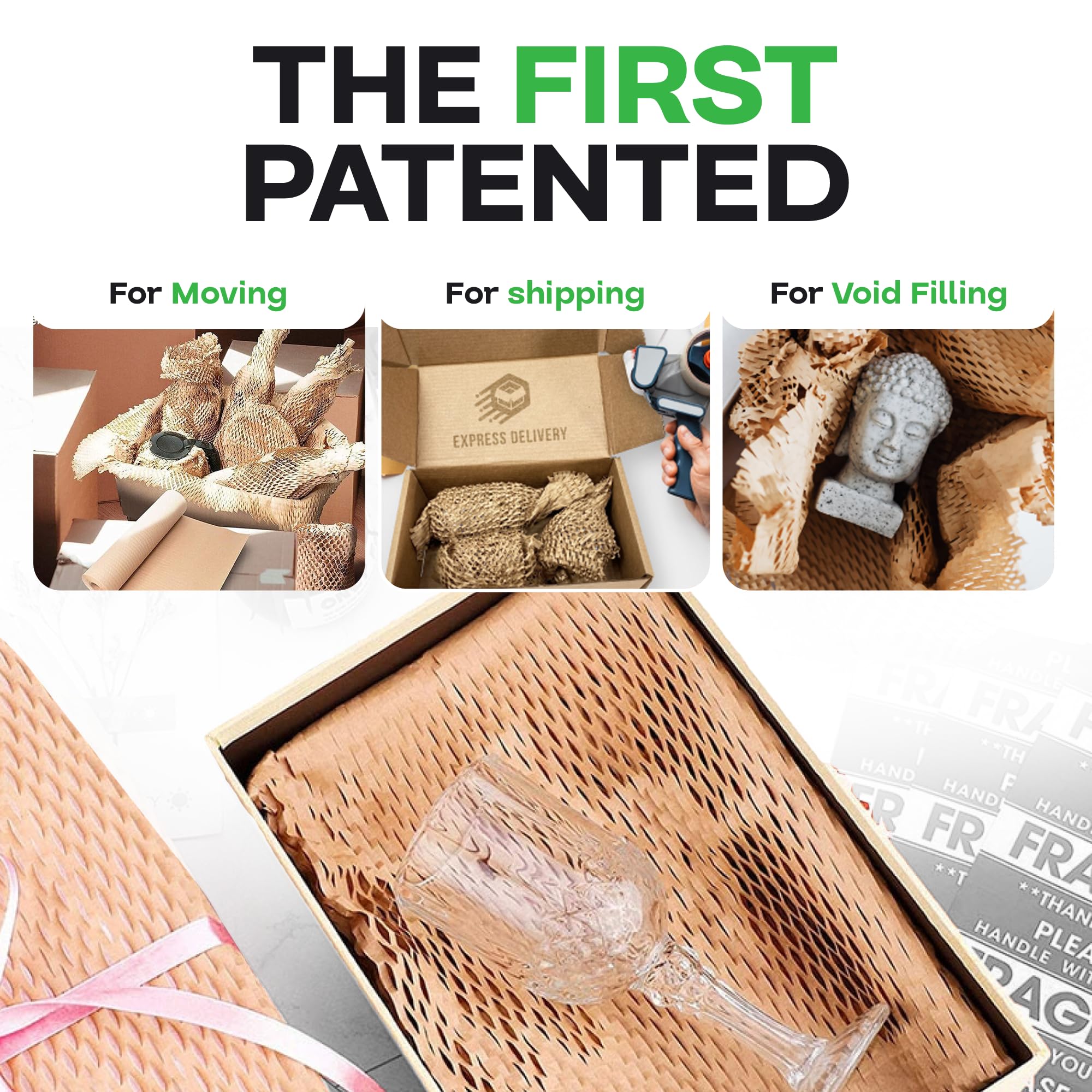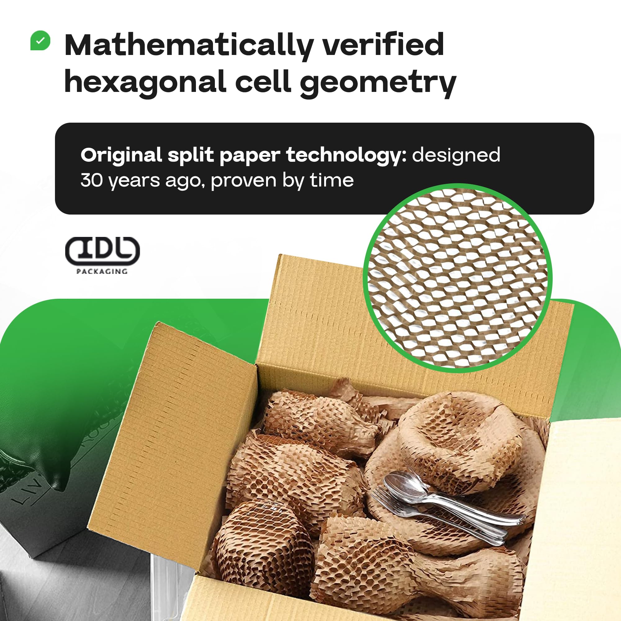 【THE ONLY PROVEN SLIT PAPER TECHNOLOGY】 The HexcelWrap produced by the slit paper technology was developed over 30 years ago, and it's been proven to be an effective packing material. Due to the engineered hexagonal cells, this honeycomb wrapping expands as you wrap your items, creating an interlocking web trap. The resulting three-dimensional cushioning product (paper) replaces traditional plastic, bubble, and other paper-based packaging products in terms of properties and efficiency