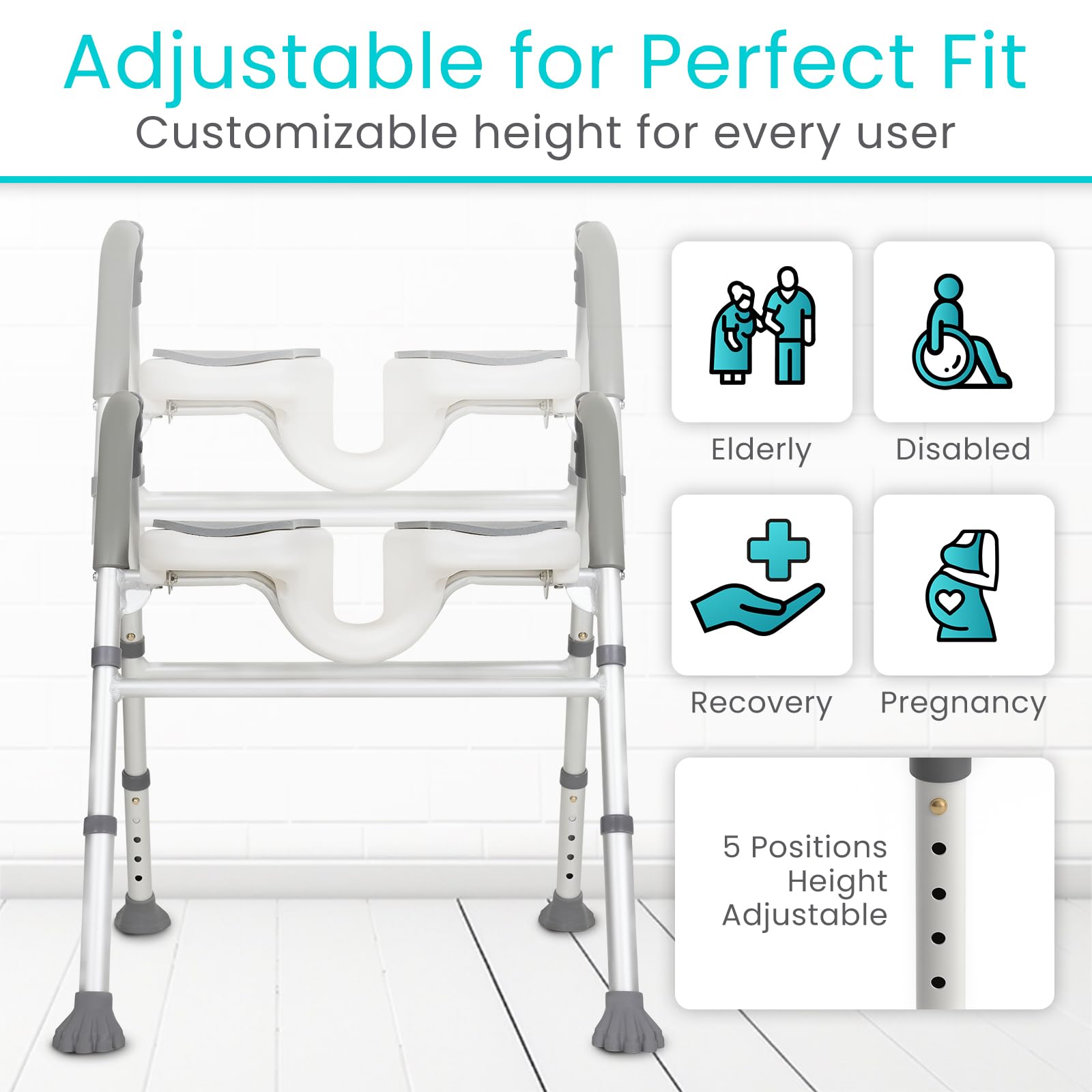 COMPACT FOLDING DESIGN: Built to fit easily within most walk-in or tub-style showers, this space-saving chair features a front-folding frame that collapses flat in seconds for quick storage or travel. Its lightweight design is ideal for small bathrooms, shared living spaces, and on-the-go use—without compromising strength or stability.