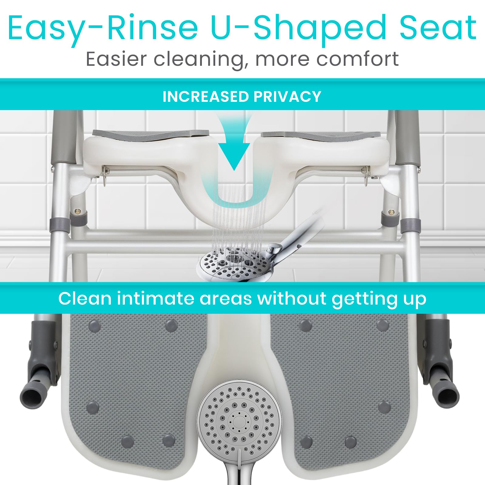 SPLIT SEAT FOR EASY CLEANING ACCESS: Designed for comfort and independence, this ergonomic shower chair features a unique split underseat design that allows easier personal cleaning and better hygiene access. The open-seat design fits most standard shower spaces, supporting self-care tasks and improved confidence for seniors, adults, and those with limited mobility—helping users maintain their dignity and independence in the bathroom.