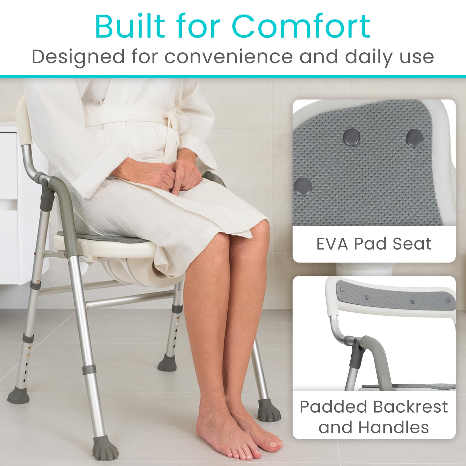 CUSTOMIZABLE COMFORT FIT FITS MOST SHOWERS: Designed to adapt to different users and shower sizes, the cushioned, height-adjustable seat and backrest provide personalized comfort. The non-slip textured padding prevents sliding, while the ergonomic contours promote proper posture for safer, more enjoyable bathing in nearly any standard shower.